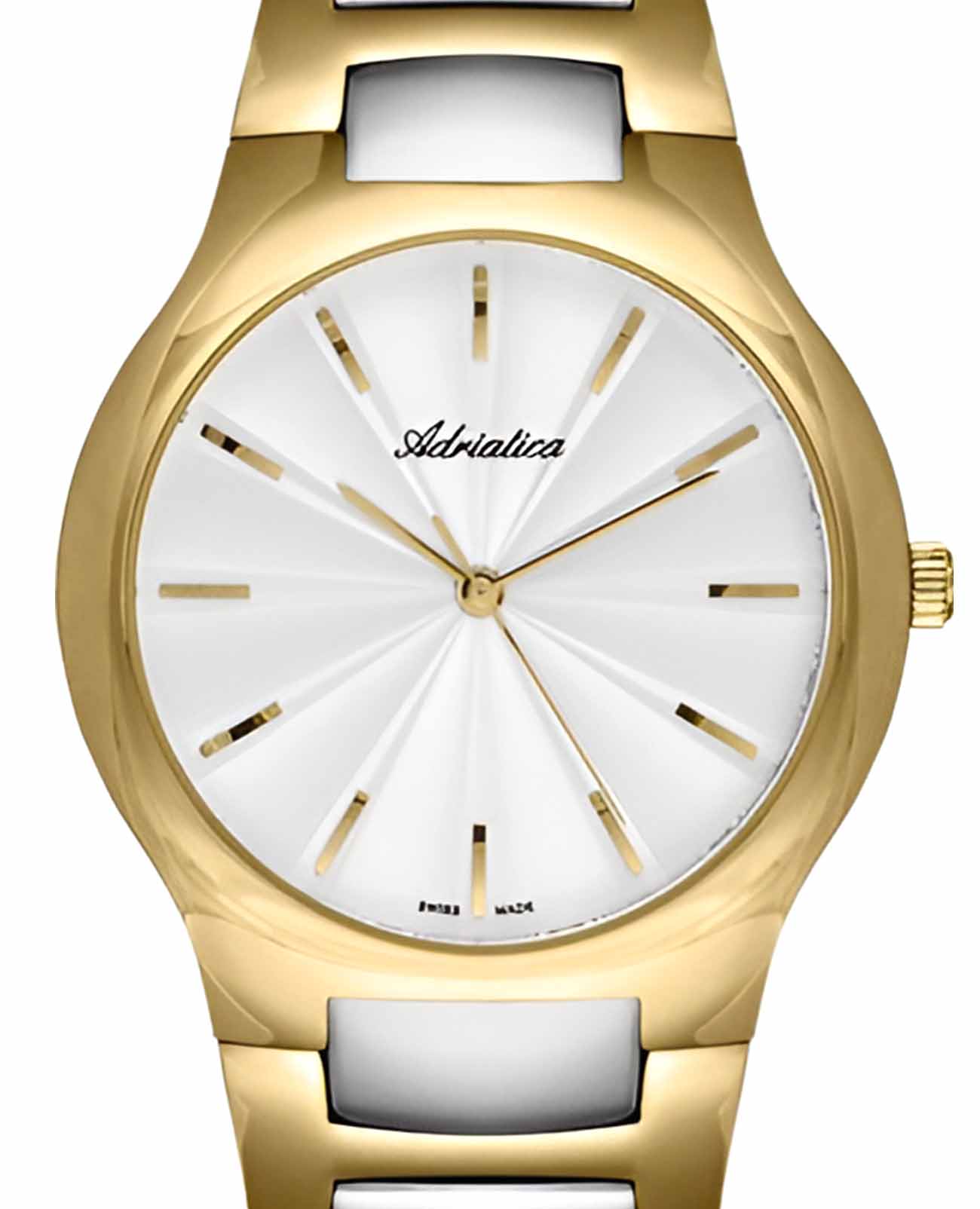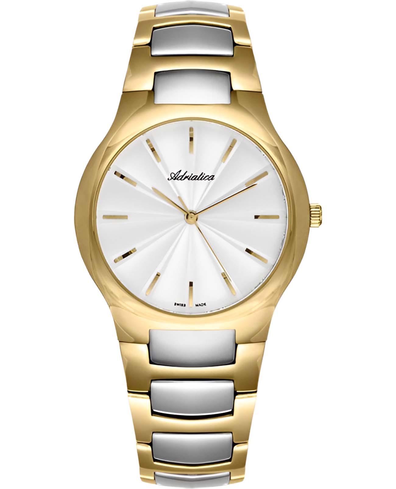 Часы Adriatica A3425.2113Q воплощают в себе утонченность и надежность швейцарского часового искусства. Эти часы идеально подойдут для тех, кто ценит стиль и качество в одном изделии. Серебристый циферблат защищен минеральным стекломМинеральное стеклоМинеральное стекло представляет собой искусственно выращенный минерал кварца. Такое стекло отличается особой устойчивостью к повреждениям и царапинам. Уступает по некоторым качествам сапфировому стеклу. и заключен в корпус, выполненный из нержавеющей стали с PVDPVDУльтратонкое покрытие наносится в технике вакуумного напыления, сочетает в себе нитрид титана особой прочности со слоем золота или оксида хрома. Несёт в себе декоративную или защитную функцию. покрытием цвета желтого золота, которое придает дополнительную прочность и элегантный вид. Часы оснащены кварцевым механизмом Ronda 763, обеспечивающим высокую точность и надежность. Водозащита 50WR делает их устойчивыми к воздействию воды, что позволяет не беспокоиться о случайных брызгах. Стальной браслет с частичным PVDPVDУльтратонкое покрытие наносится в технике вакуумного напыления, сочетает в себе нитрид титана особой прочности со слоем золота или оксида хрома. Несёт в себе декоративную или защитную функцию. покрытием цвета желтого золота с раскладной застёжкойРаскладная застёжкаТакой тип застёжки используется только на браслетах из металла. Она никогда не раскрывается полностью, происходит разделение на 2 и более частей. Раскладывающая застёжка снизит вероятность потери часов к минимуму. подчеркивает современный стиль и обеспечивает комфортное ношение.
