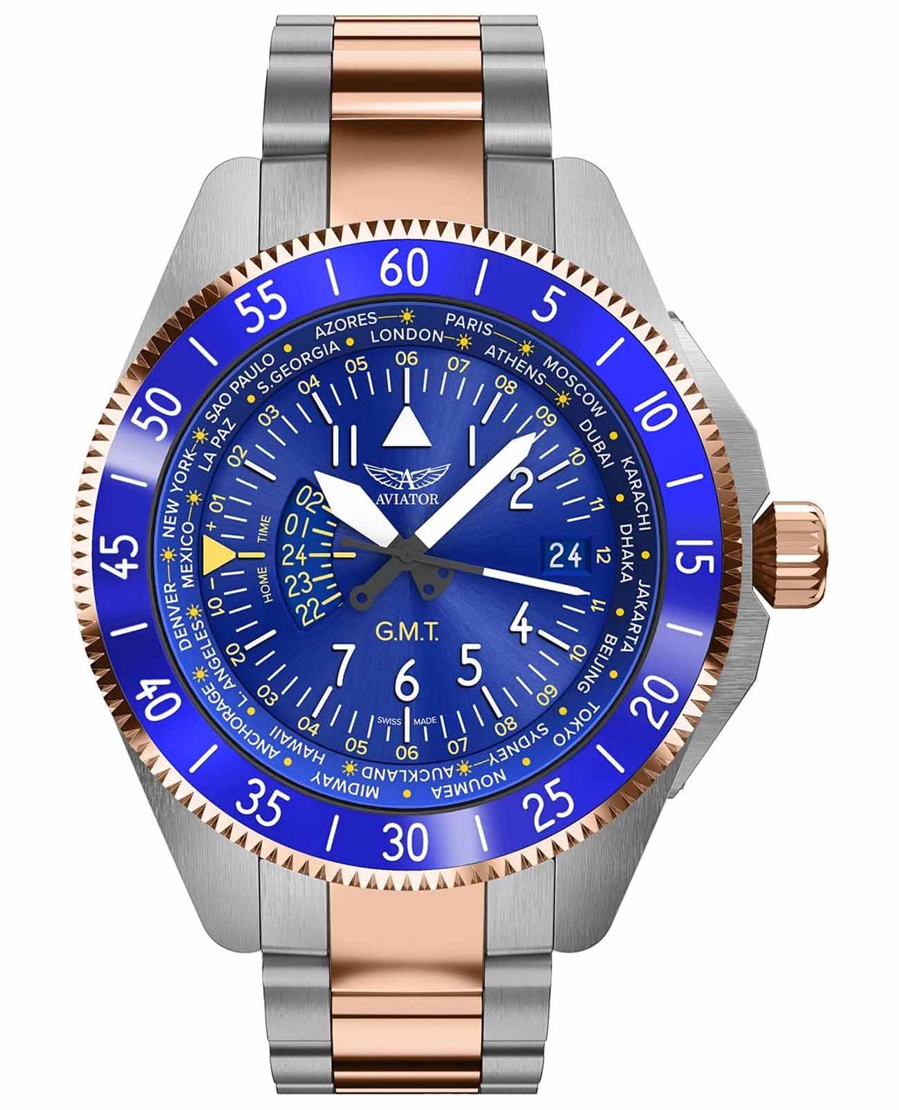 Aviator Airacobra V.1.37.3.308.5 “Airacobra GMT” — сбалансированный швейцарский пилотский GMT‑хронометр, сочетающий техническую строгость с удобными функциями для путешествий. Корпус диаметром 43 мм из нержавеющей стали с PVD-покрытиемPVDУльтратонкое покрытие наносится в технике вакуумного напыления, сочетает в себе нитрид титана особой прочности со слоем золота или оксида хрома. Несёт в себе декоративную или защитную функцию. обеспечивает уверенное ощущение надёжности, а герметичность до 100 м защищает при любой погоде .