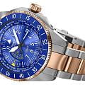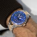 Циферблат отличается детальной функциональностью: в центре — крупные арабские цифры и стрелки, покрытые люминесцентным покрытиемЛюминесцентное покрытиеПозволяет считывать показания времени в темноте. Производители наносят на стрелки, часовые индексы, безель или поверхность циферблата светонакопительный состав, дающий холодное свечение., обеспечивающими мгновенное считывание времени даже в темноте. На «3 часах» — окошко даты, а индикатор второго часового пояса (GMT) удобно расположен на «9 часах». С внешней стороны — вращающийся безельБезельВнешний ободок, закрепляющий стекло. В спортивных часах так называется поворотное кольцо с делениями на циферблате, выполняет роль таймера – замеряет отрезки времени на шкале. Неподвижный безель – элемент декора. Однонаправленно вращающийся безель на дайверских часах позволяет фиксировать моменты погружения и выныривания на поверхность. с PVD-покрытиемPVDУльтратонкое покрытие наносится в технике вакуумного напыления, сочетает в себе нитрид титана особой прочности со слоем золота или оксида хрома. Несёт в себе декоративную или защитную функцию. с насечкой и градусной шкалой для секунд — идеален для расчёта времени пути или времени прибытия .