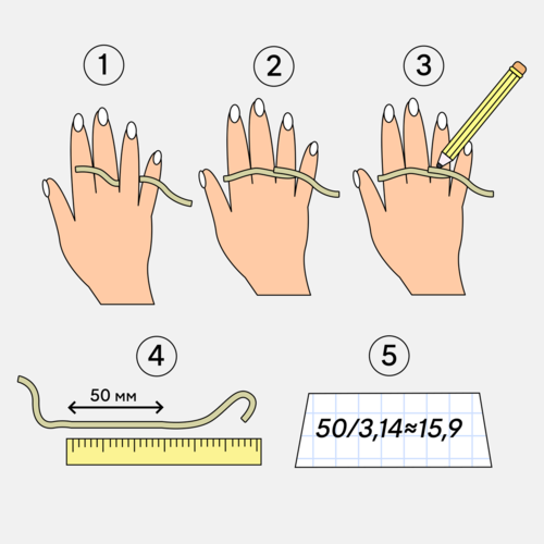 измерьте длину отрезка нити линейкой — это обхват вашего пальца. Разделите значение на 3,14 — так вы получите нужный результат
