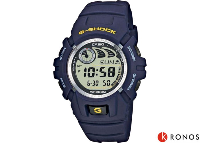 Аксессуар в спортивном обличье представляет противоударную коллекциюCasio G-Shock, стильно выглядит сочетание синего цвета с ярко-жёлтыми элементами. Уникальность часов заключается в продолжительном сроке службы батарейки, аккумулятор способен проработать без необходимости замены 10 лет.
