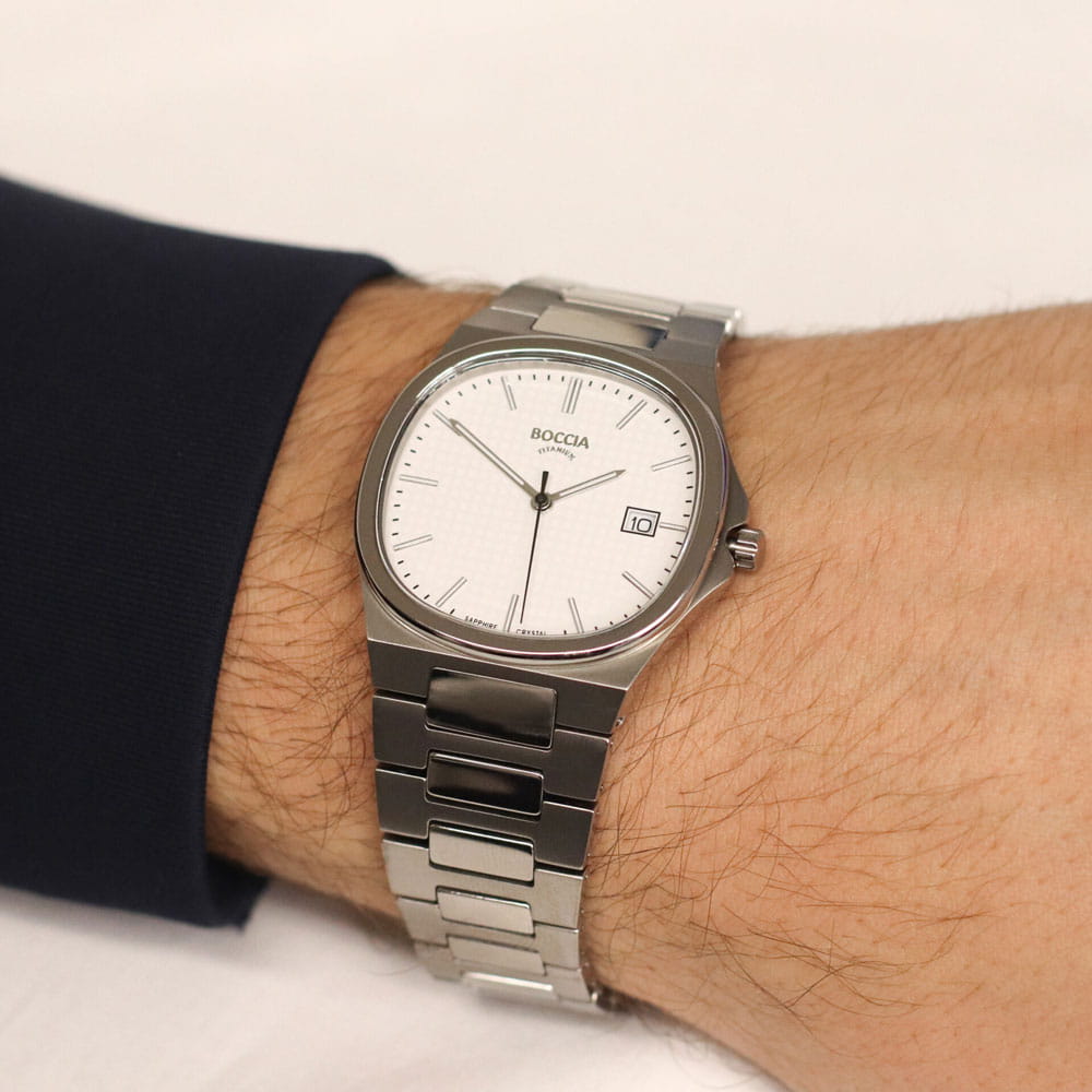 Boccia Titanium Square 3657-01 – элегантные мужские часы, сочетающие современный стиль и передовые технологии. Корпус диаметром 39 мм выполнен из титана, что обеспечивает лёгкость, прочность и гипоаллергенные свойства. Серебристый циферблат с квадратным узором и стрелками, покрытыми люминесцентным покрытиемЛюминесцентное покрытиеПозволяет считывать показания времени в темноте. Производители наносят на стрелки, часовые индексы, безель или поверхность циферблата светонакопительный состав, дающий холодное свечение., обеспечивает отличную читаемость в любых условиях, а его поверхность защищена сапфировым стекломСапфировое стеклоПрочный и надёжный материал из кристалла сапфира синтетического происхождения, характеризующийся особой твёрдостью и устойчивостью к царапинам и повреждениям., устойчивым к царапинам.