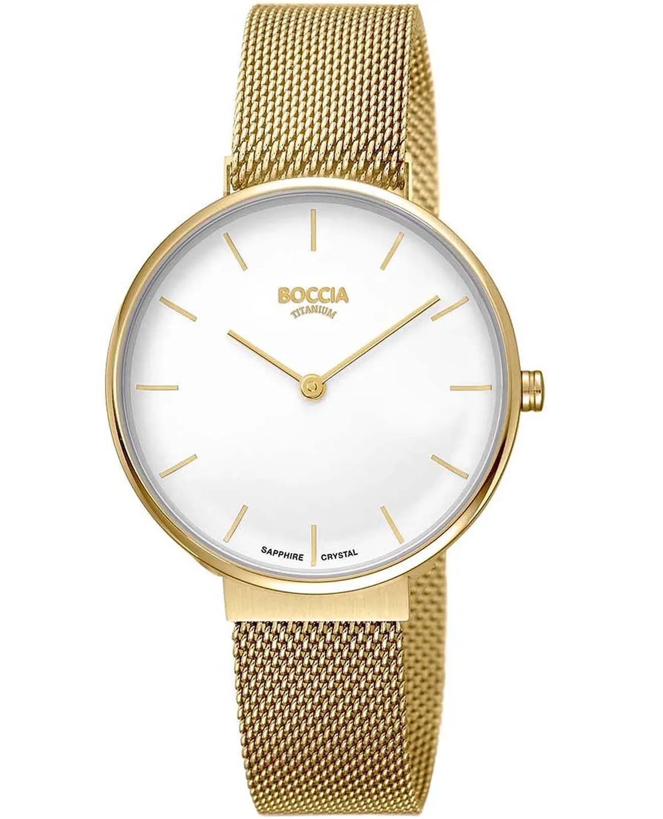 Женские наручные часы Boccia Titanium 3327-10 с надёжным кварцевым механизмом. Корпус часов изготовлен из титана с PVD-покрытиемPVDУльтратонкое покрытие наносится в технике вакуумного напыления, сочетает в себе нитрид титана особой прочности со слоем золота или оксида хрома. Несёт в себе декоративную или защитную функцию.. Сапфировое стеклоСапфировое стеклоПрочный и надёжный материал из кристалла сапфира синтетического происхождения, характеризующийся особой твёрдостью и устойчивостью к царапинам и повреждениям. устойчивое к мелким механическим повреждениям. Класс водозащиты: 30 метров, позволит защитить корпус от случайных брызг или капель дождя. Стальной браслет миланского плетения на раскладном замкеРаскладной замокДанный вариант застежки используется только на часах с металлическим браслетом. Отличительная особенность такого крепления в том, что длина браслета становится универсальной и вы можете самостоятельно отрегулировать нужный вам размер – застежка просто двигается по браслету часов.