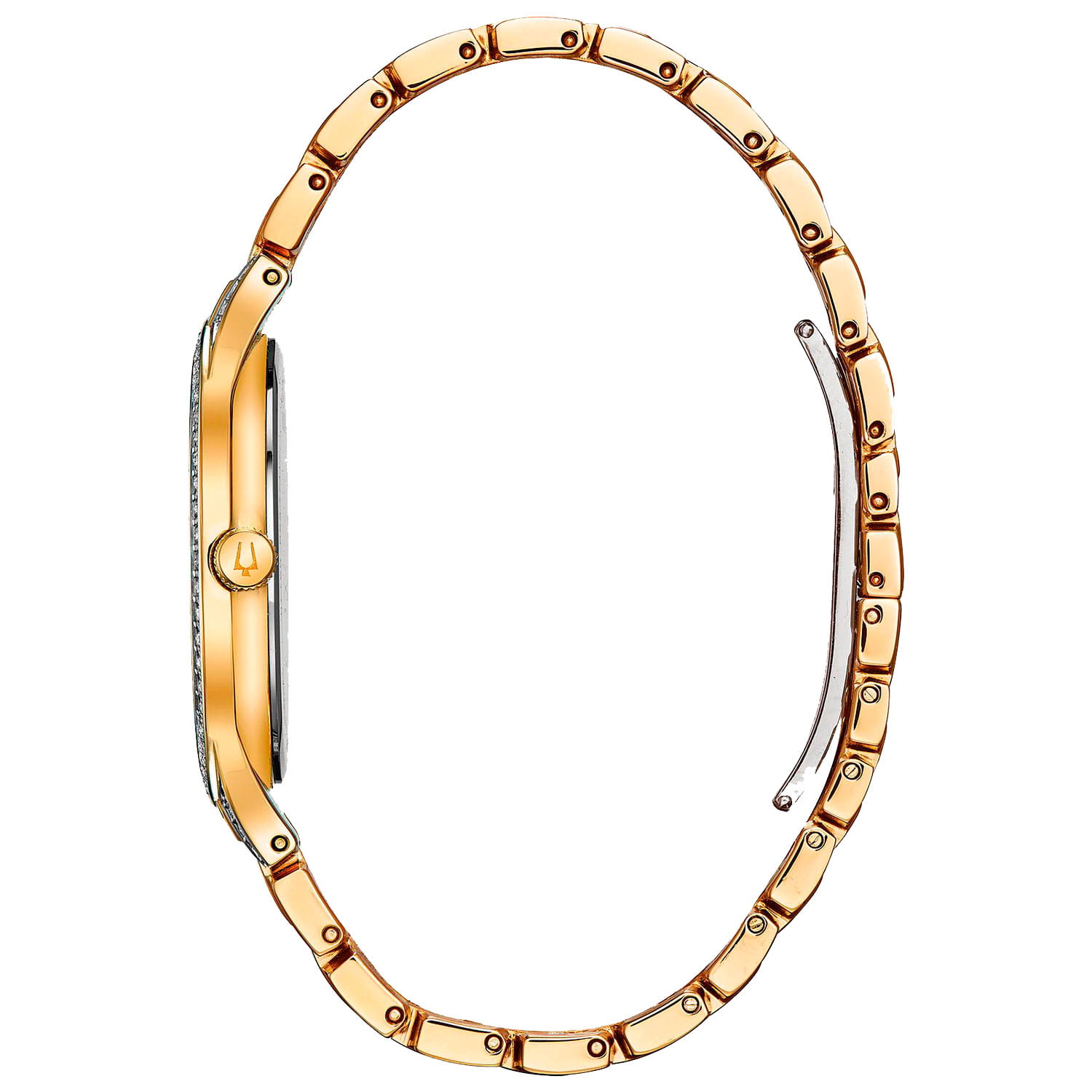 Мужские кварцевые часы Bulova Phantom 98A229 – отражающий идеальное сочетание современного дизайна, надёжности и функциональности. Элегантный облик станет превосходным завершением образа, наделив его индивидуальным характером. Корпус из нержавеющей стали с IP-покрытиемIP-покрытиеМетод ионного напыления. Демонстрирует повышенную устойчивость к истиранию, окислению и химическим веществам. Под воздействием высокого давления и температуры около 1500°C молекулы металла надёжно соединяются с частицами корпуса часов. золотистого цвета, диаметром 40 мм идеально сбалансирован и элегантен. Минеральное стеклоМинеральное стеклоМинеральное стекло представляет собой искусственно выращенный минерал кварца. Такое стекло отличается особой устойчивостью к повреждениям и царапинам. Уступает по некоторым качествам сапфировому стеклу. защищает циферблат от царапин и устойчиво к мелким механическим повреждениям. БезельБезельВнешний ободок, закрепляющий стекло. В спортивных часах так называется поворотное кольцо с делениями на циферблате, выполняет роль таймера – замеряет отрезки времени на шкале. Неподвижный безель – элемент декора. Однонаправленно вращающийся безель на дайверских часах позволяет фиксировать моменты погружения и выныривания на поверхность., браслет и циферблат полностью покрыты 636 кристаллами. Стальной браслет на застёжке-бабочке с кнопкамиЗастёжка "бабочка"Такой вид застёжки дополняется предохранителями, помогающими избежать случайного раскрытия браслета. Обладают изящным исполнением. обеспечивает комфортное ношение. Водозащита 30 метров позволит защитить корпус от случайных брызг или капель дождя. Эта модель – отличный выбор для тех, кто ищет сочетание стиля, качества и функциональности. Часы станут не только полезным аксессуаром, но и выразительным элементом вашего имиджа.