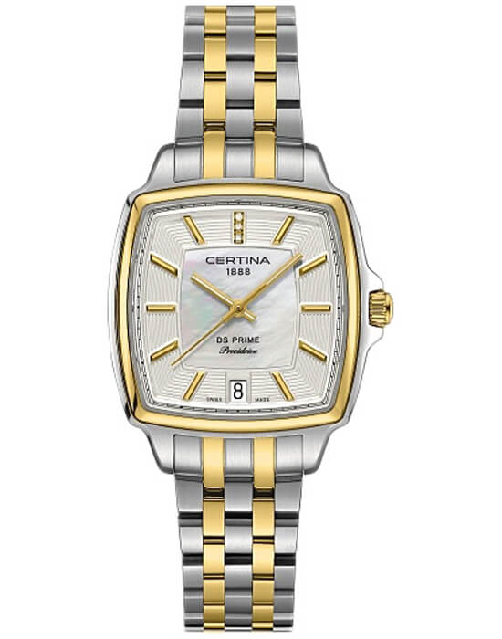Квадратный перламутровый циферблат декорирован 3 сияющими бриллиантами на метке 12. Швейцарский кварцевый механизм ETA F06.411 Precidrive™Precidrive™Инновационный кварцевый механизм Certina. Часы, оснащённые этим швейцарским калибром, приравниваются к точности к сертифицированным хронометрам, точность хода составляет +/-10 секунд в год. помогает измерять время с высокой точностью. Корпус и браслет из нержавеющей стали 316L с золотистым PVD-покрытиемPVDУльтратонкое покрытие наносится в технике вакуумного напыления, сочетает в себе нитрид титана особой прочности со слоем золота или оксида хрома. Несёт в себе декоративную или защитную функцию..