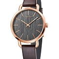 Лаконичный циферблат украшен узором, напоминающим природную текстуру. Стальной корпус с PVD-покрытиемPVDУльтратонкое покрытие наносится в технике вакуумного напыления, сочетает в себе нитрид титана особой прочности со слоем золота или оксида хрома. Несёт в себе декоративную или защитную функцию. защищает швейцарский кварцевый механизм ETA F05.101. Классический кожаный ремешок изящно смотрится на запястье. Степень водостойкости - WR 30, часы выдержат мелкие водяные брызги.