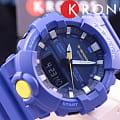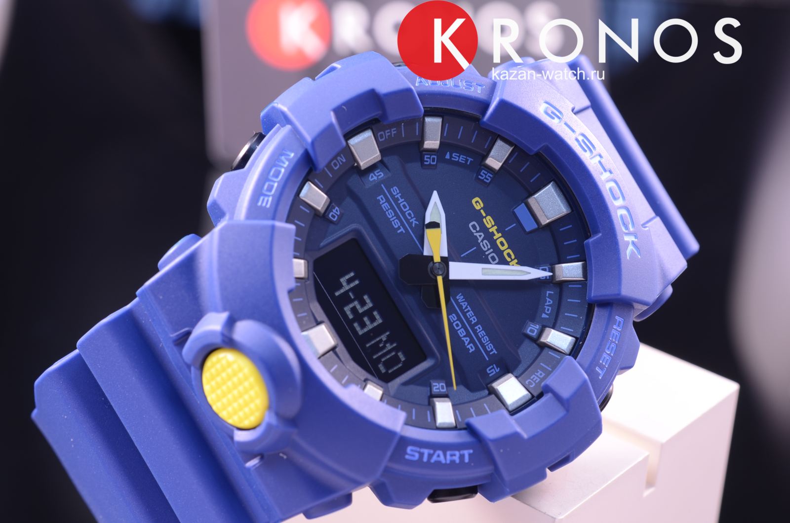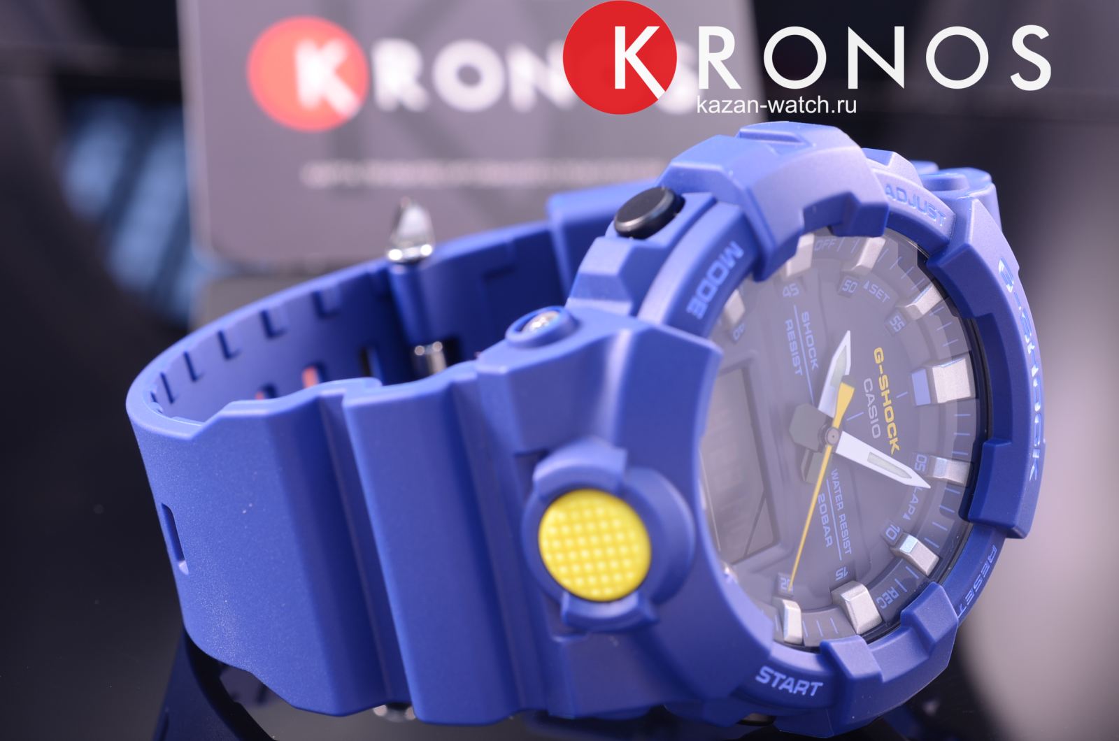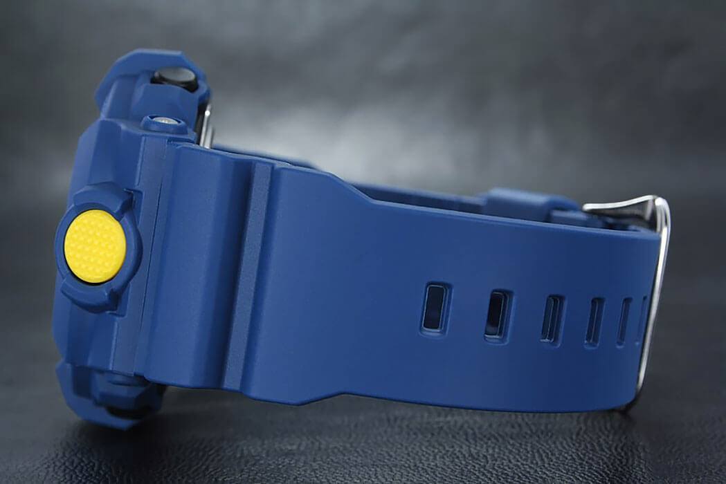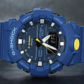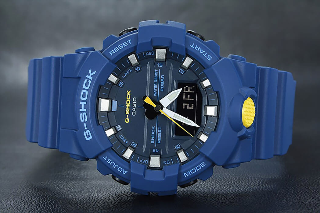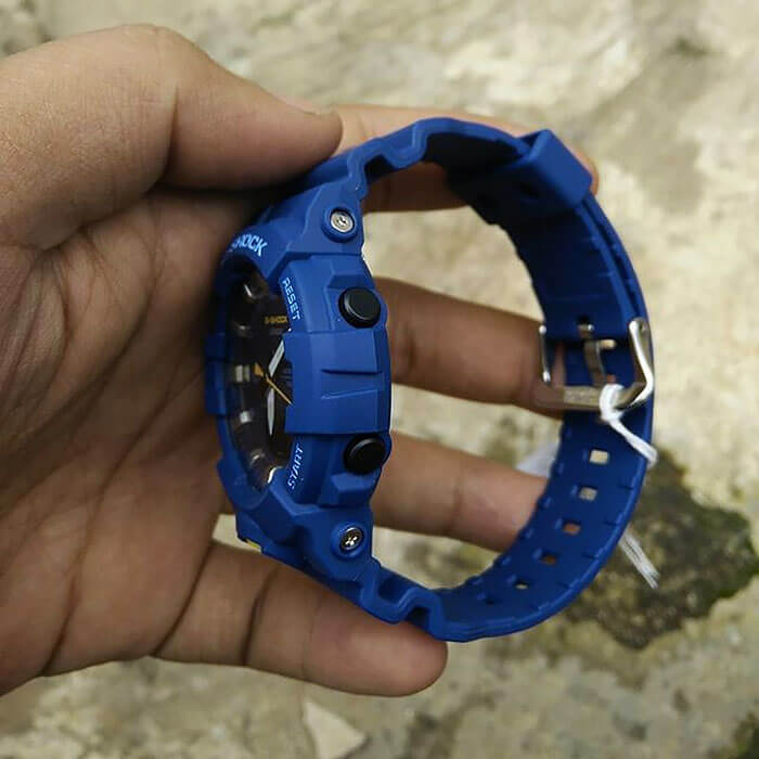 Ярко-синяя модель с голубыми и жёлтыми деталями точно станет запоминающейся деталью вашего образа. Часы получили обновлённый дизайн и уменьшенный противоударный корпусУдаропрочный корпусМеханизм заключён в корпус, выполненный из современных материалов, устойчивых к ударам, механическим повреждениям и падению с высоты: инновационный пластик, карбон, нержавеющая сталь, титан., если сравнивать с моделями серии GA-700. Он выполнен из полимерного пластика, что гарантирует повышенную устойчивость к ударам, повреждениям, падению с высоты. Японский кварцевый калибр с точностью хода +/- 15 секунд в месяц. Срок службы батарейки - 3 года. Функция выключения и включения звука кнопок. Стрелки с люминесцентным покрытиемЛюминесцентное покрытиеПозволяет считывать показания времени в темноте. Производители наносят на стрелки, часовые индексы, безель или поверхность циферблата светонакопительный состав, дающий холодное свечение.. Двойная светодиодная подсветкаСветодиодная подсветкаСветодиодная или LED-подсветка обеспечивает появление яркого холодного свечения за счёт LED-элементов - маленьких лампочек. Они потребляют минимальное количество энергии, чаще всего можно встретить 1 светодиод, в нижней части циферблата.. Водозащита 20 бар. Минеральное стекло. Полимерный браслет. Секундомер, таймер обратного отсчёта, мировое времяМировое время Полезное часовое усложнение, отображающее время в основных городах и известных областях по всему миру, оно связано с часовыми поясами, удобно для путешественников и бизнесменов. , 5 ежедневных будильников, автоматический календарь. Габариты: 54,1 x 48,6 x 15,5 мм.