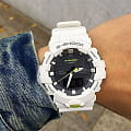 Белая модель с жёлтыми деталями точно станет запоминающейся деталью вашего образа. Часы получили обновлённый дизайн и уменьшенный противоударный корпусУдаропрочный корпусМеханизм заключён в корпус, выполненный из современных материалов, устойчивых к ударам, механическим повреждениям и падению с высоты: инновационный пластик, карбон, нержавеющая сталь, титан., если сравнивать с моделями серии GA-700. Он выполнен из полимерного пластика, что гарантирует повышенную устойчивость к ударам, повреждениям, падению с высоты. Японский кварцевый калибр с точностью хода +/- 15 секунд в месяц. Срок службы батарейки - 3 года. Функция выключения и включения звука кнопок. Стрелки с люминесцентным покрытиемЛюминесцентное покрытиеПозволяет считывать показания времени в темноте. Производители наносят на стрелки, часовые индексы, безель или поверхность циферблата светонакопительный состав, дающий холодное свечение.. Двойная светодиодная подсветкаСветодиодная подсветкаСветодиодная или LED-подсветка обеспечивает появление яркого холодного свечения за счёт LED-элементов - маленьких лампочек. Они потребляют минимальное количество энергии, чаще всего можно встретить 1 светодиод, в нижней части циферблата.. Водозащита 20 бар. Минеральное стекло. Полимерный браслет. Секундомер, таймер обратного отсчёта, мировое времяМировое время Полезное часовое усложнение, отображающее время в основных городах и известных областях по всему миру, оно связано с часовыми поясами, удобно для путешественников и бизнесменов. , 5 ежедневных будильников, автоматический календарь. Габариты: 54,1 x 48,6 x 15,5 мм.
