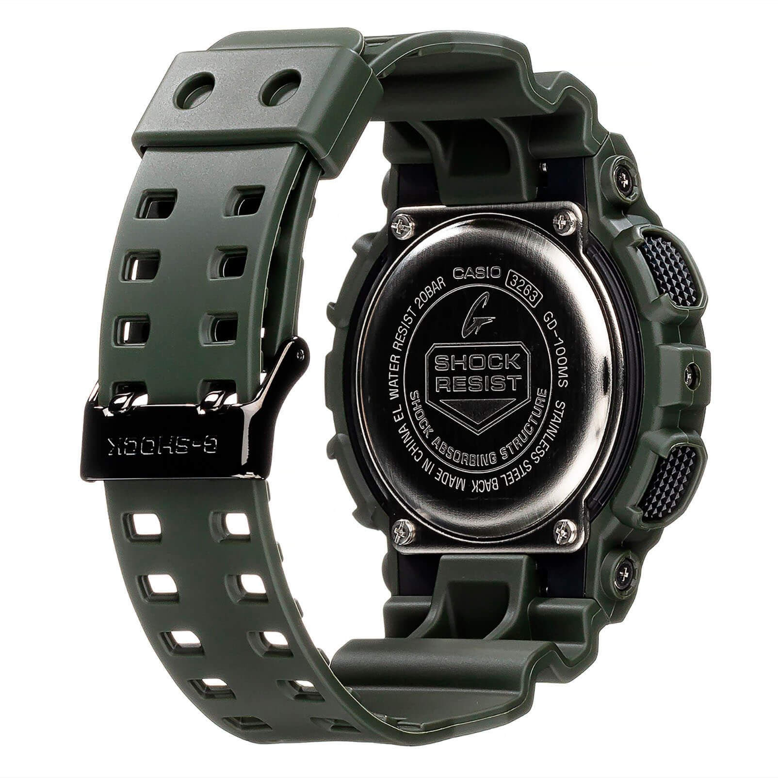 Японские мужские часы GD-100MS-3ER из коллекции G-Shock представлены в строгом и лаконичном облике с сохранением общего спортивного оформления.