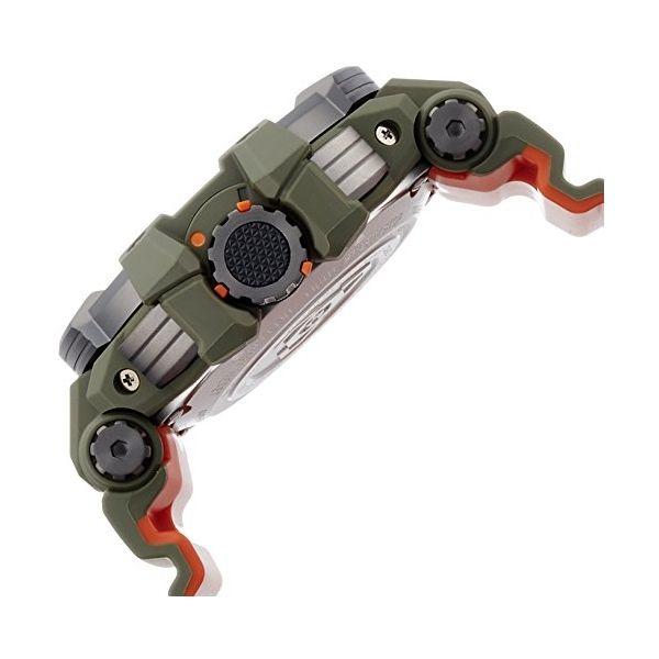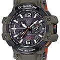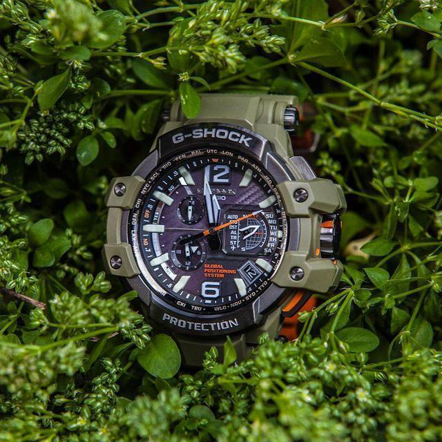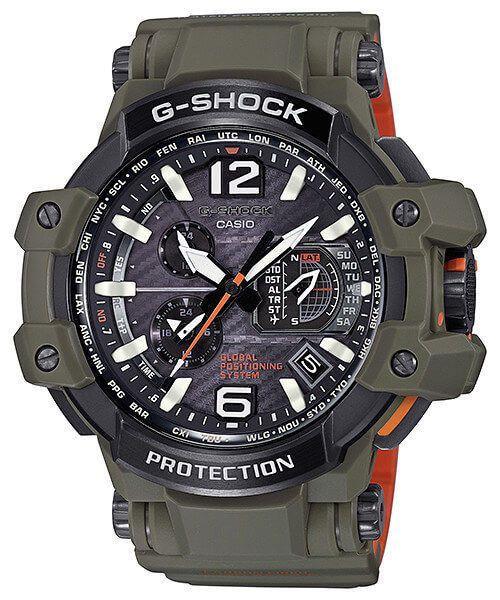 Перед вами модель из флагманской серии G-SHOCK GPW в милитаристическом дизайне цвета хаки, черным стальным безелем и яркими оранжевыми деталями — это первые в мире часы с GPS- и радио-синхронизацией времени с атомными часами в разных частях света.