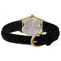 Яркий, золотой корпус часов привлекательно сочетается вместе с черным ремнем из кожи. Циферблат модели имеет круглую форму и выдержан в цвете шампань. На циферблате расположены аккуратные показатели времени и три стильные, золотые стрелки. Кварцевый механизм часов работает от батарейки. Циферблат надежно защищен от повреждений минеральным стеклом. Данная модель имеет показатель водонепроницаемости WR10. Прочный корпус аксессуара сделан из латуни.