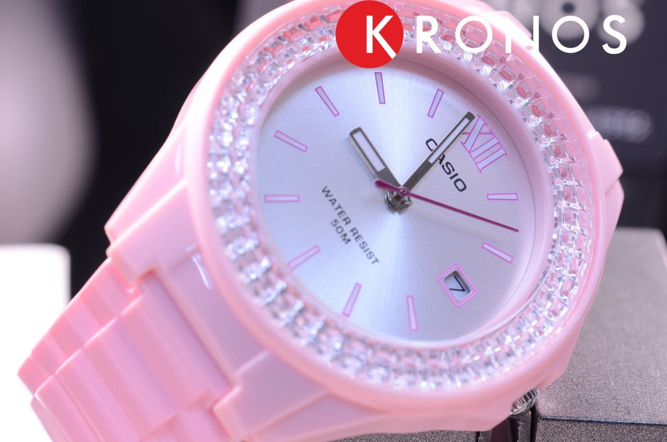 Корпус аккуратных и ярких наручных часов от Casio сделан из пластика. Яркий безельБезельВнешний ободок, закрепляющий стекло. В спортивных часах так называется поворотное кольцо с делениями на циферблате, выполняет роль таймера – замеряет отрезки времени на шкале. Неподвижный безель – элемент декора. Однонаправленно вращающийся безель на дайверских часах позволяет фиксировать моменты погружения и выныривания на поверхность. вокруг циферблата отражает падающий свет и добавляет аксессуару привлекательности. На круглом циферблате серебристого цвета расположены аккуратные римские цифры и штрихи. Благодаря кварцевому механизму отсутствует необходимость каждый раз заводить часы. Благодаря подсветке NeobriteПодсветка NeobriteИспользование светонакопительных составов на основе сульфида цинка или алюмината стронция, яркий свет можно наблюдать на протяжении 6-10 часов после «зарядки» часов около источника света. узнать информацию на циферблате легко даже в темное время суток. Водонепроницаемость составляет 50 WR.