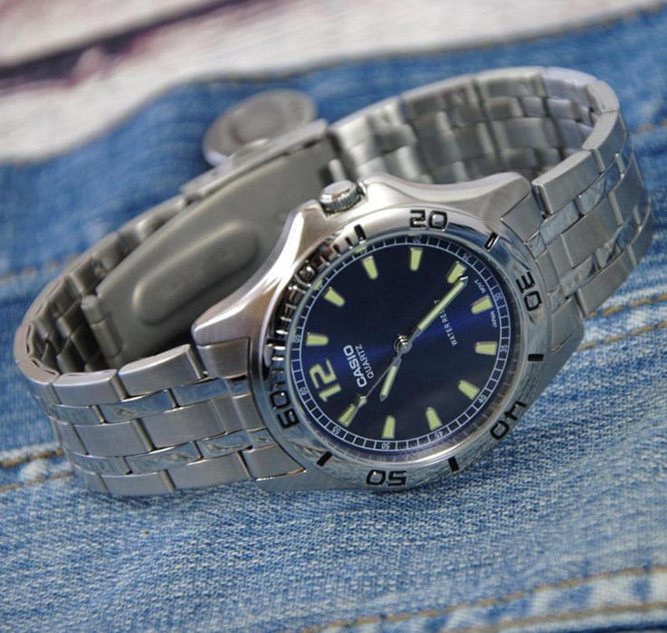 Данная модель от Casio придется по вкусу ценителям высокого качества, комфорта и стильного дизайна. Корпус выполнен из латуни. Стальной браслет прочно обхватывает запястье и закрепляется с помощью раскладывающейся застежки. Синий циферблат традиционной формы обрамляет аккуратный безельБезельВнешний ободок, закрепляющий стекло. В спортивных часах так называется поворотное кольцо с делениями на циферблате, выполняет роль таймера – замеряет отрезки времени на шкале. Неподвижный безель – элемент декора. Однонаправленно вращающийся безель на дайверских часах позволяет фиксировать моменты погружения и выныривания на поверхность.. Крупные отчетливые временные отметки выполнены в виде штрихов и арабских цифр. Подсветка NeobriteПодсветка NeobriteИспользование светонакопительных составов на основе сульфида цинка или алюмината стронция, яркий свет можно наблюдать на протяжении 6-10 часов после «зарядки» часов около источника света. обеспечивает видимость показателей в темное время суток. Тип механизма - кварцевый. Вес составляет 105 грамм.рейтинг магазина