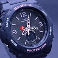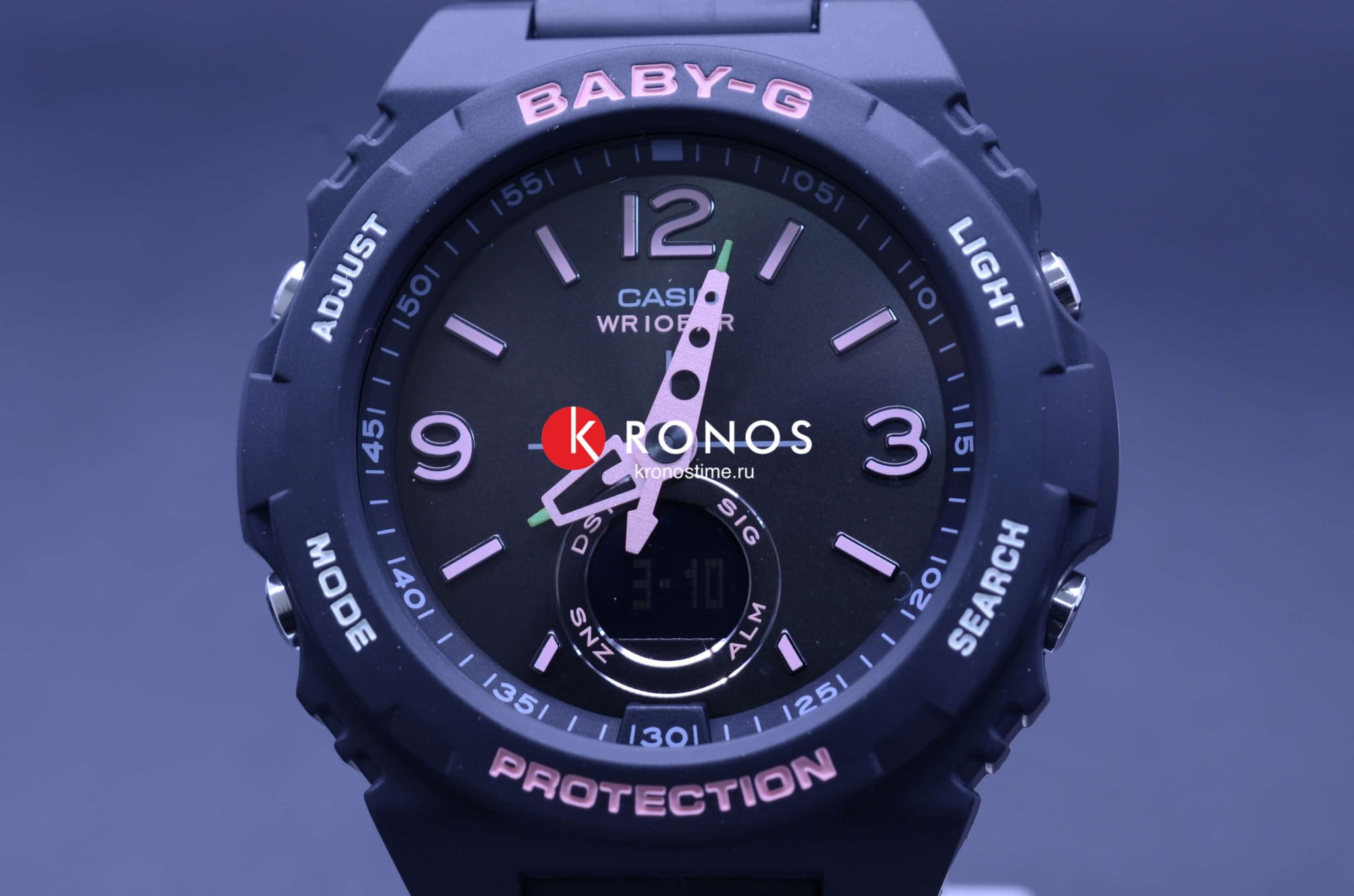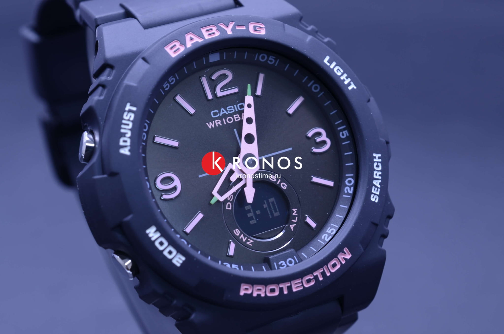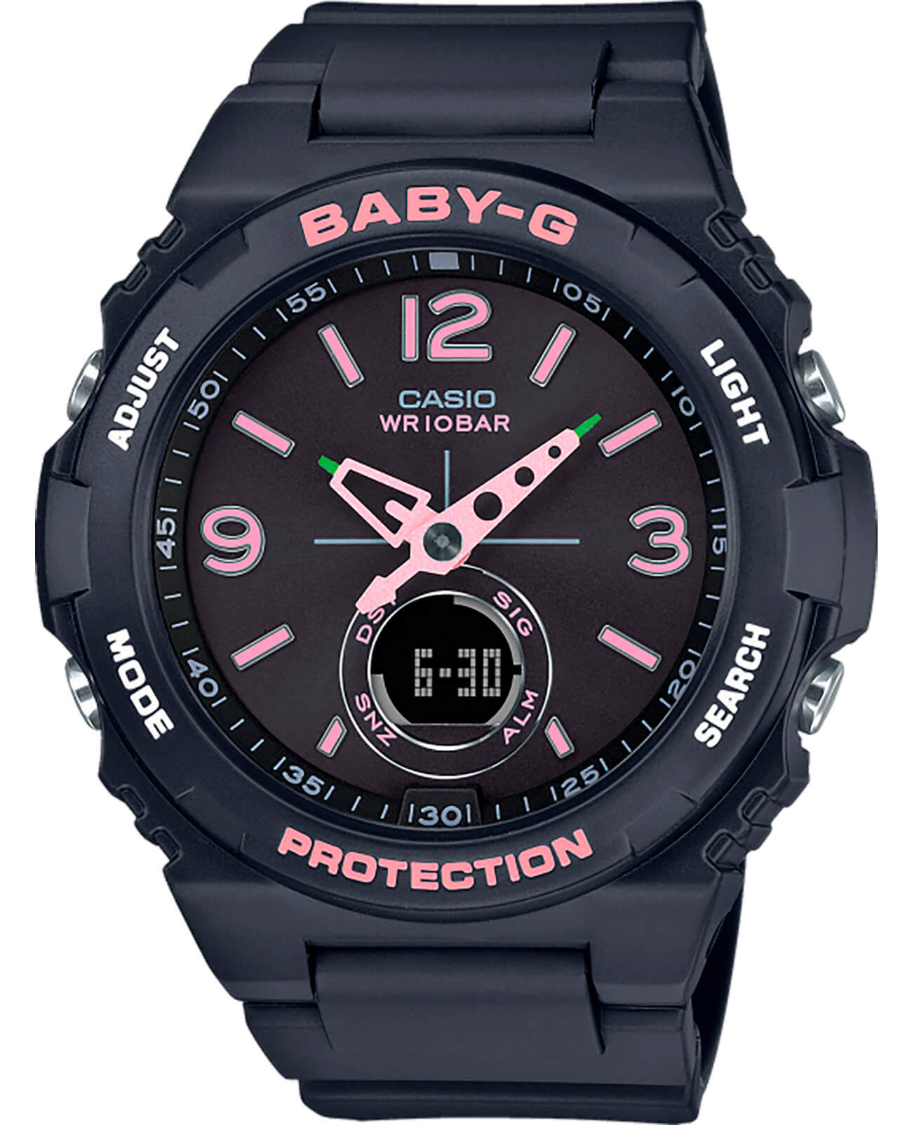 Аксессуар точно оценят модницы, ведущие активный образ жизни. Лаконичный дизайн в спортивном стиле выражен в темном исполнении с розовыми акцентами. Оригинальные стрелки имеют яркие окончания с подсветкой NeobriteПодсветка NeobriteИспользование светонакопительных составов на основе сульфида цинка или алюмината стронция, яркий свет можно наблюдать на протяжении 6-10 часов после «зарядки» часов около источника света., что положительным образом сказывается на читаемости показателей. Японский кварцевый механизм получает питание от батарейки, рассчитанной на 3 года работы. Для подсветки используется LED-светодиодСветодиодная подсветкаСветодиодная или LED-подсветка обеспечивает появление яркого холодного свечения за счёт LED-элементов - маленьких лампочек. Они потребляют минимальное количество энергии, чаще всего можно встретить 1 светодиод, в нижней части циферблата.. Закаленное минеральное стекло. Водостойкость до 10 бар. Ударопрочный корпусУдаропрочный корпусМеханизм заключён в корпус, выполненный из современных материалов, устойчивых к ударам, механическим повреждениям и падению с высоты: инновационный пластик, карбон, нержавеющая сталь, титан. и гибкий ремешок из полимерного материала. Автоматический календарь, мировое времяМировое время Полезное часовое усложнение, отображающее время в основных городах и известных областях по всему миру, оно связано с часовыми поясами, удобно для путешественников и бизнесменов. , будильник с функцией «подремать», секундомер, таймер. Габариты: 48,1 x 42,4 x 12,3 мм.