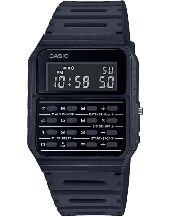 Японские мужские часы-хронографХронографФункция позволяет измерять отрезки времени с особой точностью: часы, минуты, секунды. Верным признаком хронографа является наличие на циферблате 3 дополнительных окошек-счётчиков. Casio Vintage CA-53WF-1BEF, кварцевый механизм с высокой точностью. Корпус часов изготовлен из пластика, серебристого цвета. Светодиодная подсветкаСветодиодная подсветкаСветодиодная или LED-подсветка обеспечивает появление яркого холодного свечения за счёт LED-элементов - маленьких лампочек. Они потребляют минимальное количество энергии, чаще всего можно встретить 1 светодиод, в нижней части циферблата., секундомерСекундомерСекундоме́р — прибор, способный измерять интервалы времени с точностью до долей секунды. с точностью измерений 1/100 сек., общее время измерений 24 часа. Будильник с функцией Snooze. Автоматический календарь. 8-ми разрядный калькулятор. Класс водозащиты: 30 метров, позволит защитить корпус от случайных брызг или капель дождя. Ремешок из полимерного материала на стандартной застежке.