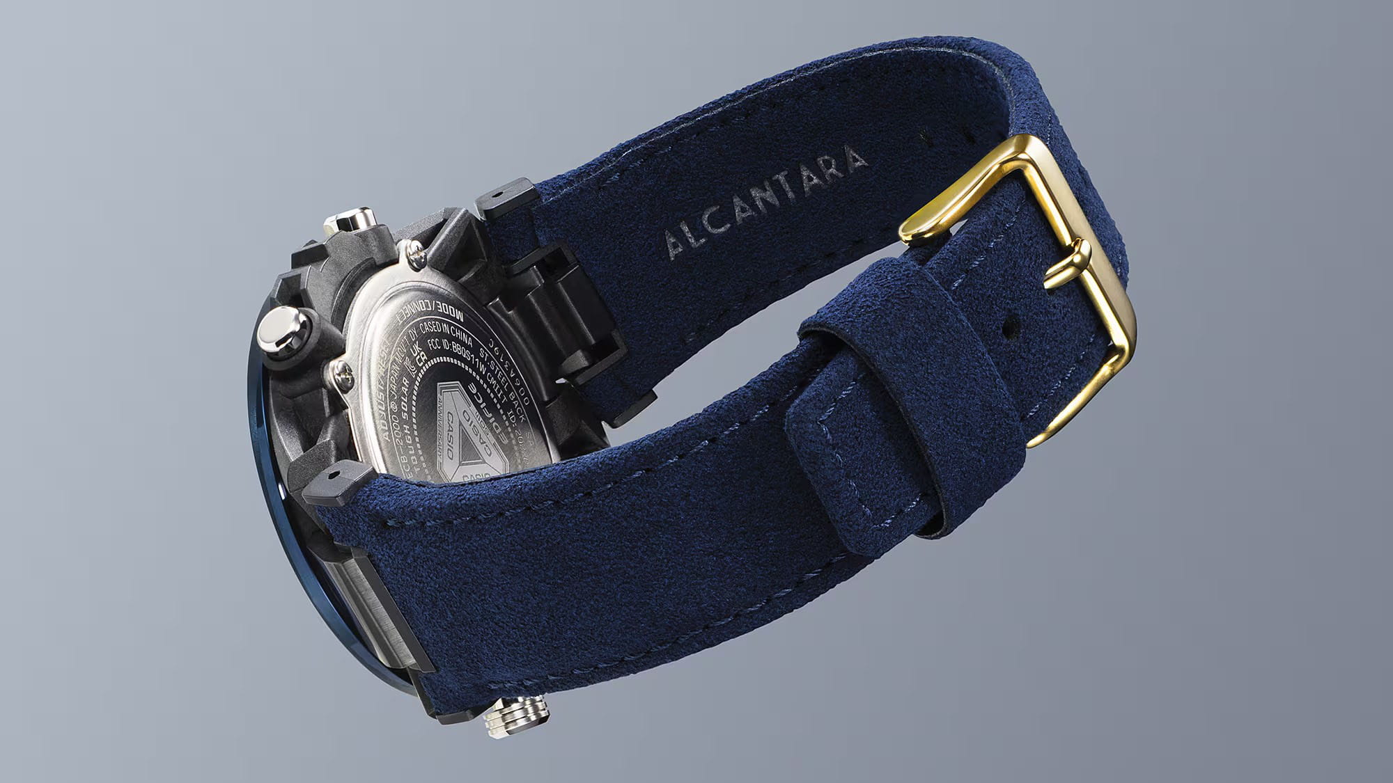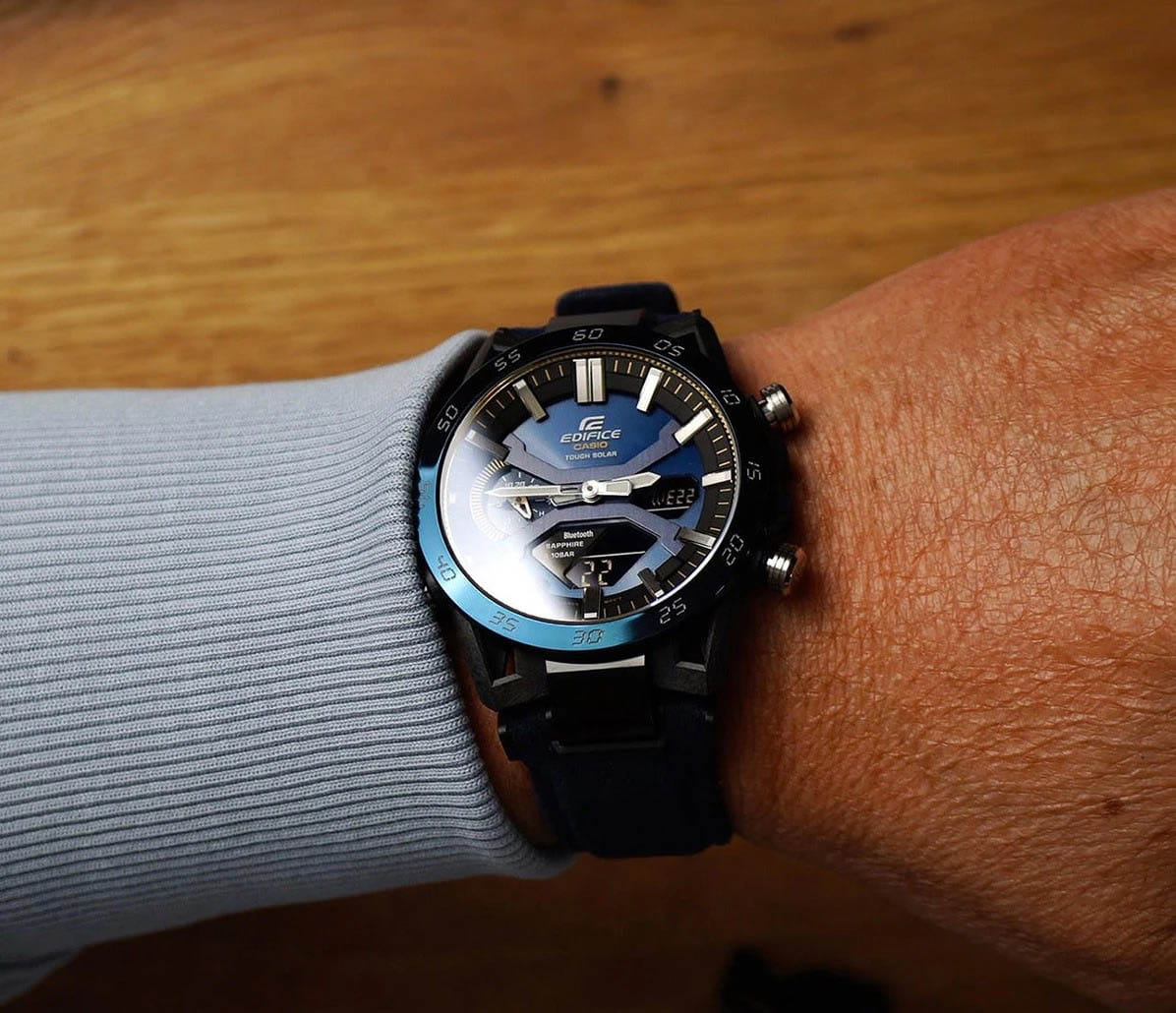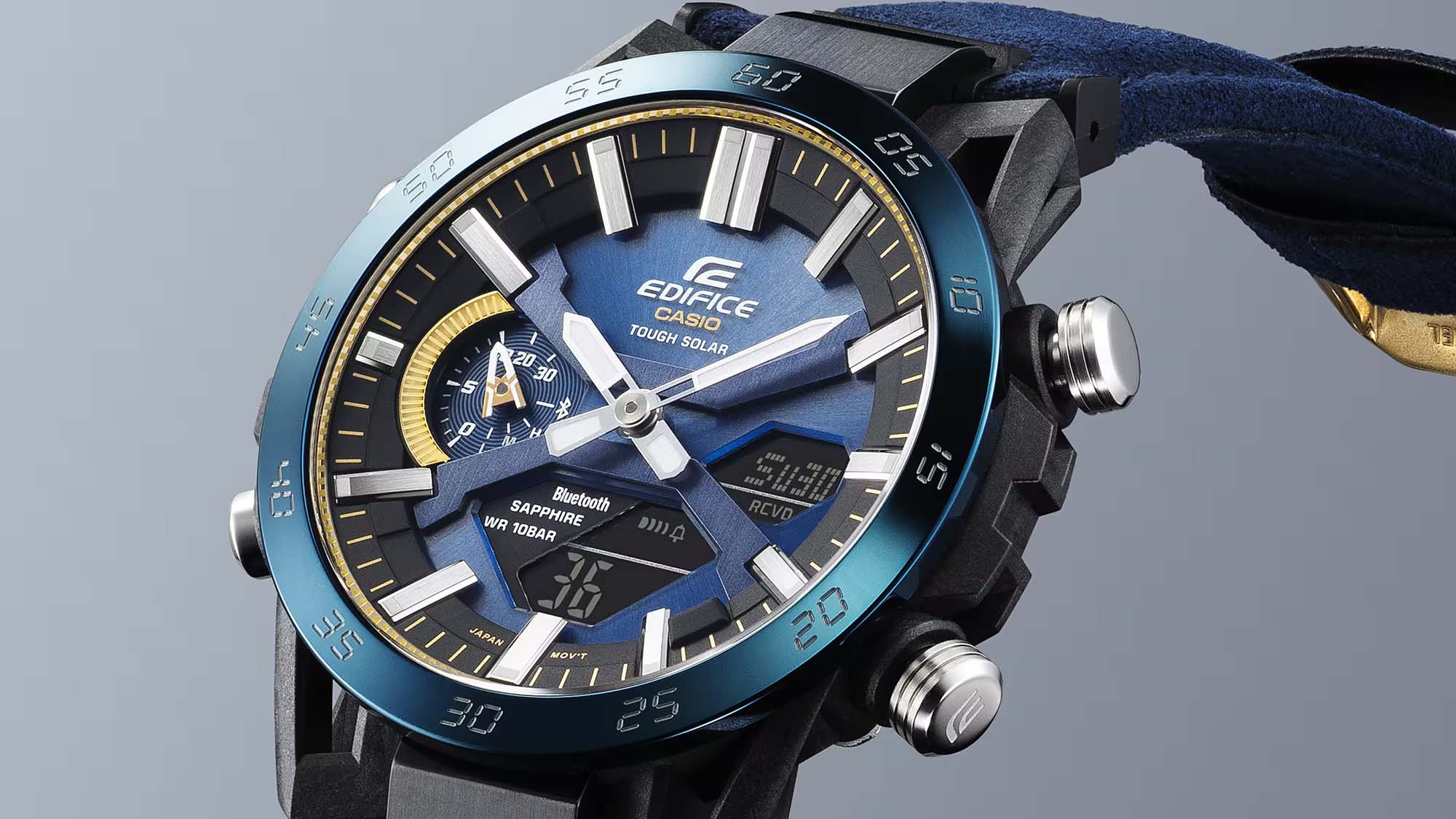 Супер редкий лимитированный релиз в коллекции Edifice 2024 года из топовой аналого-цифровой серии ECB-2000 в усиленном карбоном корпусе с глубоким синим циферблатом и деталями золотого оттенка. Модель посвящена 50-летнему юбилею часового сегмента Casio, о чем указывает гравировка на стальной задней крышке часов, а также стилистика цифр на безеле — именно такой шрифт имела самая первая цифровая модель Casio QW02, выпущенная пол века назад. Фактурное кольцо золотого цвета между безелем и циферблатом модели также унаследовано от прародителя всех часов Casio.