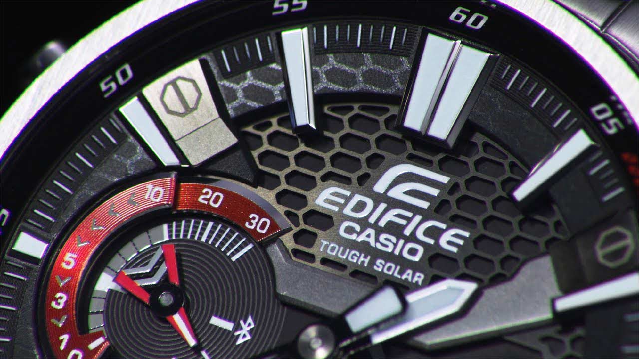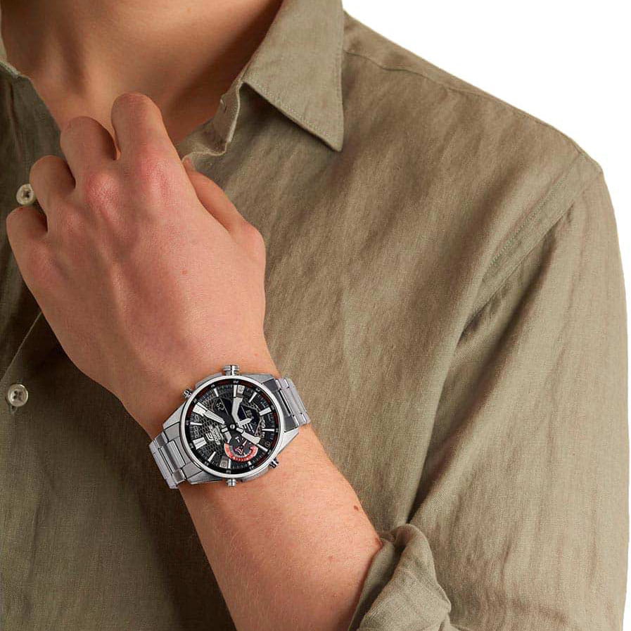 Японские мужские часы из коллекции Edifice отражают динамику и спортивный стиль, связанный с автомобильной тематикой.