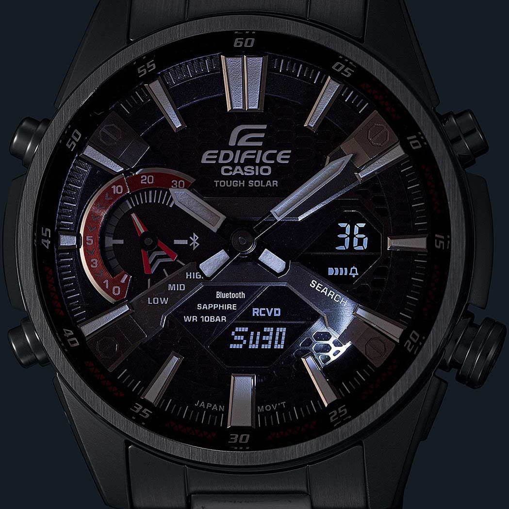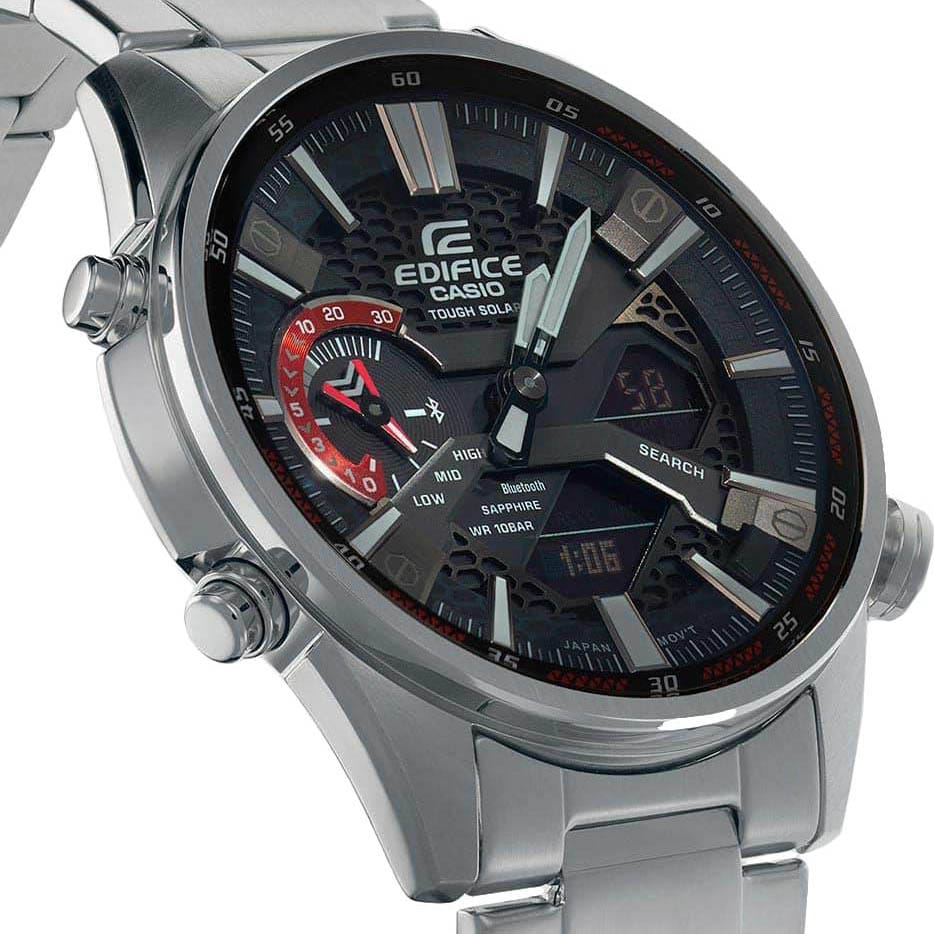 Достаточно внушительный чёрный циферблат имеет красные акценты, оригинально смотрится необычное расположение счётчиков. Многофункциональная модель пригодится на любой случай жизни, ведь она оснащена Bluetooth 4.0BluetoothСовременная технология, позволяющая синхронизировать часы с телефоном и переносить данные. Часы с Bluetooth расширяют возможности вашего смартфона и делают его использование ещё более удобным., хронографомХронографФункция позволяет измерять отрезки времени с особой точностью: часы, минуты, секунды. Верным признаком хронографа является наличие на циферблате 3 дополнительных окошек-счётчиков., секундомером, тахиметромТахиметрРазмеченная шкала, располагается на ободке или безеле часов. Тахиметр позволяет рассчитать скорость на определённом участке пути, расстояние измеряется в километрах или милях., таймером, будильником, календарём, есть мировое времяМировое время Полезное часовое усложнение, отображающее время в основных городах и известных областях по всему миру, оно связано с часовыми поясами, удобно для путешественников и бизнесменов. и функция поиска телефона. Питание поступает от солнечной энергии - . Водонепроницаемость до 10 бар. Корпус, браслет, безельБезельВнешний ободок, закрепляющий стекло. В спортивных часах так называется поворотное кольцо с делениями на циферблате, выполняет роль таймера – замеряет отрезки времени на шкале. Неподвижный безель – элемент декора. Однонаправленно вращающийся безель на дайверских часах позволяет фиксировать моменты погружения и выныривания на поверхность. из хирургической стали 316L. Минеральное стекло. Двойная светодиодная подсветкаСветодиодная подсветкаСветодиодная или LED-подсветка обеспечивает появление яркого холодного свечения за счёт LED-элементов - маленьких лампочек. Они потребляют минимальное количество энергии, чаще всего можно встретить 1 светодиод, в нижней части циферблата.. Габариты: 50 x 46 x 9,8 мм.