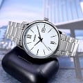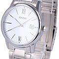 Японские мужские наручные часы с минеральным стекломМинеральное стеклоМинеральное стекло представляет собой искусственно выращенный минерал кварца. Такое стекло отличается особой устойчивостью к повреждениям и царапинам. Уступает по некоторым качествам сапфировому стеклу. Casio Collection MTP-V002D-7B3, кварцевый механизм с высокой точностью. Класс водозащиты: 30 метров, позволит защитить корпус от случайных брызг или капель дождя. Корпус часов изготовлен из стали. Стальной браслет на раскладной застёжкеРаскладная застёжкаТакой тип застёжки используется только на браслетах из металла. Она никогда не раскрывается полностью, происходит разделение на 2 и более частей. Раскладывающая застёжка снизит вероятность потери часов к минимуму.. Метки в виде штрихов и двух римских цифр.