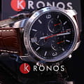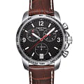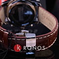 Элегантный хронографХронографФункция позволяет измерять отрезки времени с особой точностью: часы, минуты, секунды. Верным признаком хронографа является наличие на циферблате 3 дополнительных окошек-счётчиков. с коричневым ремешком из натуральной кожи идеально завершит образ делового мужчины. Швейцарский кварцевый калибр ETA G10.211 измеряет время с высокой точностью хода. Стрелки имеют люминесцентное покрытиеЛюминесцентное покрытиеПозволяет считывать показания времени в темноте. Производители наносят на стрелки, часовые индексы, безель или поверхность циферблата светонакопительный состав, дающий холодное свечение.. Функции: секундомер, EOLEOLПредставляет собой систему, уведомляющую владельца часов о необходимости замены элемента питания. За 2 недели до полного разряда батарейки секундная стрелка перестаёт ходить чётко и начинает перепрыгивать на 3-4 деления., дата, тахиметрТахиметрРазмеченная шкала, располагается на ободке или безеле часов. Тахиметр позволяет рассчитать скорость на определённом участке пути, расстояние измеряется в километрах или милях..