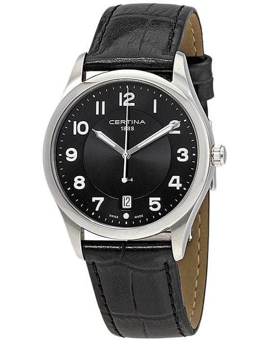 Классический циферблат чёрного цвета дополнен серебристыми стрелками, метками и арабскими цифрами, ярко выделяющимися на тёмном фоне. Ремешок из натуральной кожи с тиснением, имитирующим кожу крокодила, позволит привнести в образ нотки элегантности. Кварцевый калибр ETA E64.111. Антибликовое покрытие сапфирового стекла. Надёжный корпус из нержавеющей стали 316L. Яркая люминесцентная подсветкаЛюминесцентное покрытиеПозволяет считывать показания времени в темноте. Производители наносят на стрелки, часовые индексы, безель или поверхность циферблата светонакопительный состав, дающий холодное свечение.. Концепция ударопрочности DS Concept DS ConceptDouble Security Concept, обозначает двойную надёжность и безупречную точность часов Certina. Двойная система защиты подразумевает обеспечение максимальной устойчивости к ударам и высоких показателей водонепроницаемости.. Водостойкость 100 метров. Апертура даты, индикатор EOLEOLПредставляет собой систему, уведомляющую владельца часов о необходимости замены элемента питания. За 2 недели до полного разряда батарейки секундная стрелка перестаёт ходить чётко и начинает перепрыгивать на 3-4 деления.. Диаметр корпуса: 37 мм.