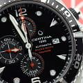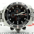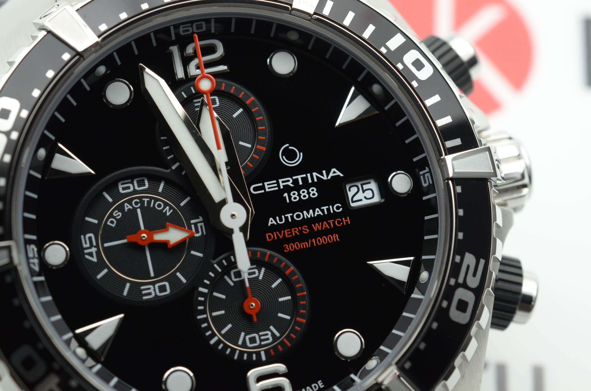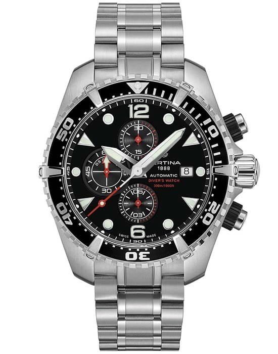 Габаритный хронографХронографФункция позволяет измерять отрезки времени с особой точностью: часы, минуты, секунды. Верным признаком хронографа является наличие на циферблате 3 дополнительных окошек-счётчиков. с чёрным циферблатом выгодно подчеркнёт повседневный или деловой образ. Модель соответствует стандарту ISO 6425 для дайверских часов и может похвастаться повышенной водостойкостью до 30 бар. Заводная головка, кнопки и задняя крышка завинчиваются для дополнительной герметичности. Аксессуар позволит вам чувствовать себя на высоте и в воде, и на суше. Автоматический швейцарский калибр ETA C01.211. Сапфировое стекло с двухсторонней антибликовой обработкой. Алюминиевый вращающийся безельБезельВнешний ободок, закрепляющий стекло. В спортивных часах так называется поворотное кольцо с делениями на циферблате, выполняет роль таймера – замеряет отрезки времени на шкале. Неподвижный безель – элемент декора. Однонаправленно вращающийся безель на дайверских часах позволяет фиксировать моменты погружения и выныривания на поверхность.. Система DS ConceptDS ConceptDouble Security Concept, обозначает двойную надёжность и безупречную точность часов Certina. Двойная система защиты подразумевает обеспечение максимальной устойчивости к ударам и высоких показателей водонепроницаемости.. Корпус и браслет из стали с антикоррозионными свойствами. Люминесцентная подсветкаЛюминесцентное покрытиеПозволяет считывать показания времени в темноте. Производители наносят на стрелки, часовые индексы, безель или поверхность циферблата светонакопительный состав, дающий холодное свечение.. Календарь, секундомер. Застёжка с фиксатором и удлинением для дайверовУдлинение для дайверовЗастёжка с удлинением для дайверов представляет собой безопасное крепление, которое позволяет надевать часы поверх гидрокостюма. Гибкая застёжка удлиняется на 1-2 миллиметра.. Диаметр корпуса: 45,7 мм.