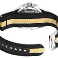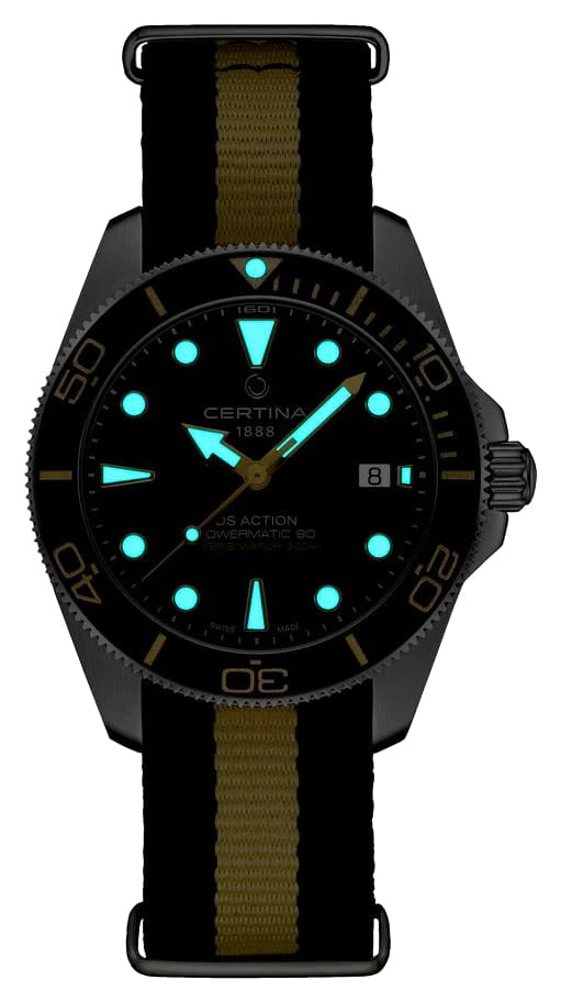 Мужские механические часы Certina DS-Action C0484071805101 — это надёжный аксессуар, созданный для тех, кто ценит сочетание швейцарского качества, функциональности и стиля. Модель входит в коллекцию Aqua, что подчёркивает её предназначение для водных активностей. Корпус диаметром 40,5 мм выполнен из нержавеющей стали с чёрной керамической рамкой, которая не только придаёт модели спортивный вид, но и защищает механизм от царапин. Циферблат чёрного цвета дополнен люминесцентными стрелками и индексами, обеспечивающими отличную читаемость даже в условиях слабого освещения. Защиту механизма обеспечивает сапфировое стеклоСапфировое стеклоПрочный и надёжный материал из кристалла сапфира синтетического происхождения, характеризующийся особой твёрдостью и устойчивостью к царапинам и повреждениям. с антибликовым покрытиемАнтибликовое покрытиеСлой оксида металла в 0,13-0,3 микрон, благодаря которому стекло часов не бликует и не отражает свет. Антибликовое покрытие уменьшает отражение света в 10 раз, обеспечивая отличную читаемость показателей циферблата., устойчивое к повреждениям. Часы оснащены автоматическим механизмом с запасом хода до 80 часов и пружиной баланса Nivachron™, что гарантирует высокую точность и долговечность. Функция отображения времени (часы, минуты, секунды) и даты делает модель удобной для повседневного использования. Водонепроницаемость позволяет использовать часы на глубине до 300 метров — идеально для плавания и ныряния. Ремешок NATO чёрного и золотистого цвета застёгивается на булавку, обеспечивая комфорт и надёжную фиксацию на запястье. Концепция DS, лежащая в основе всех моделей бренда, обеспечивает двойную защиту от ударов и вибраций, а также повышенную устойчивость к внешним воздействиям. Эти часы станут универсальным аксессуаром для тех, кто ценит сочетание стиля, функциональности и надёжности — идеальный выбор для повседневной носки и активного образа жизни.