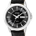 Наручные мужские часы с кварцевым механизмом, оснащенным индикаторами даты и дня недели. Стальной корпус круглой формы и кожаный ремешок черного цвета.