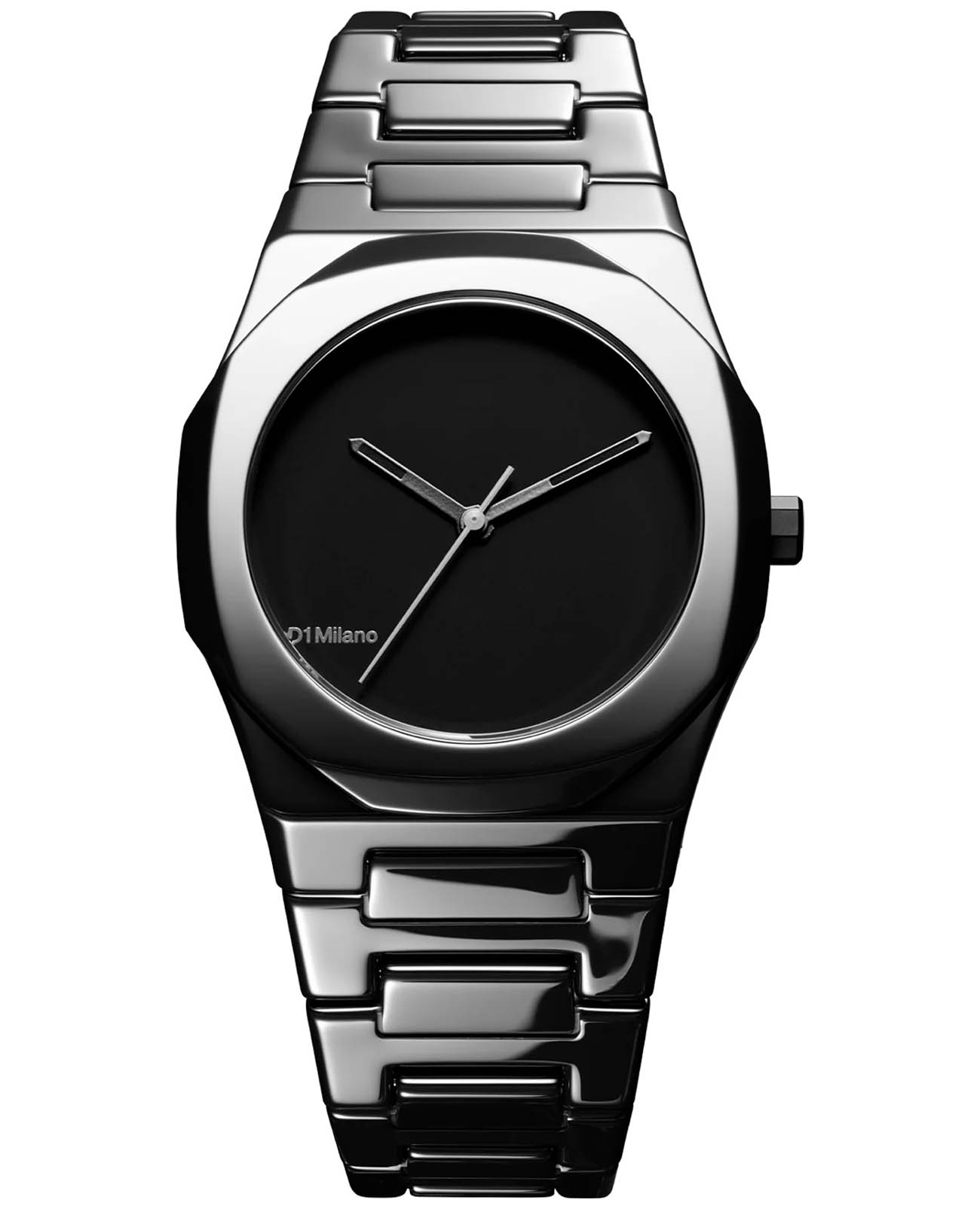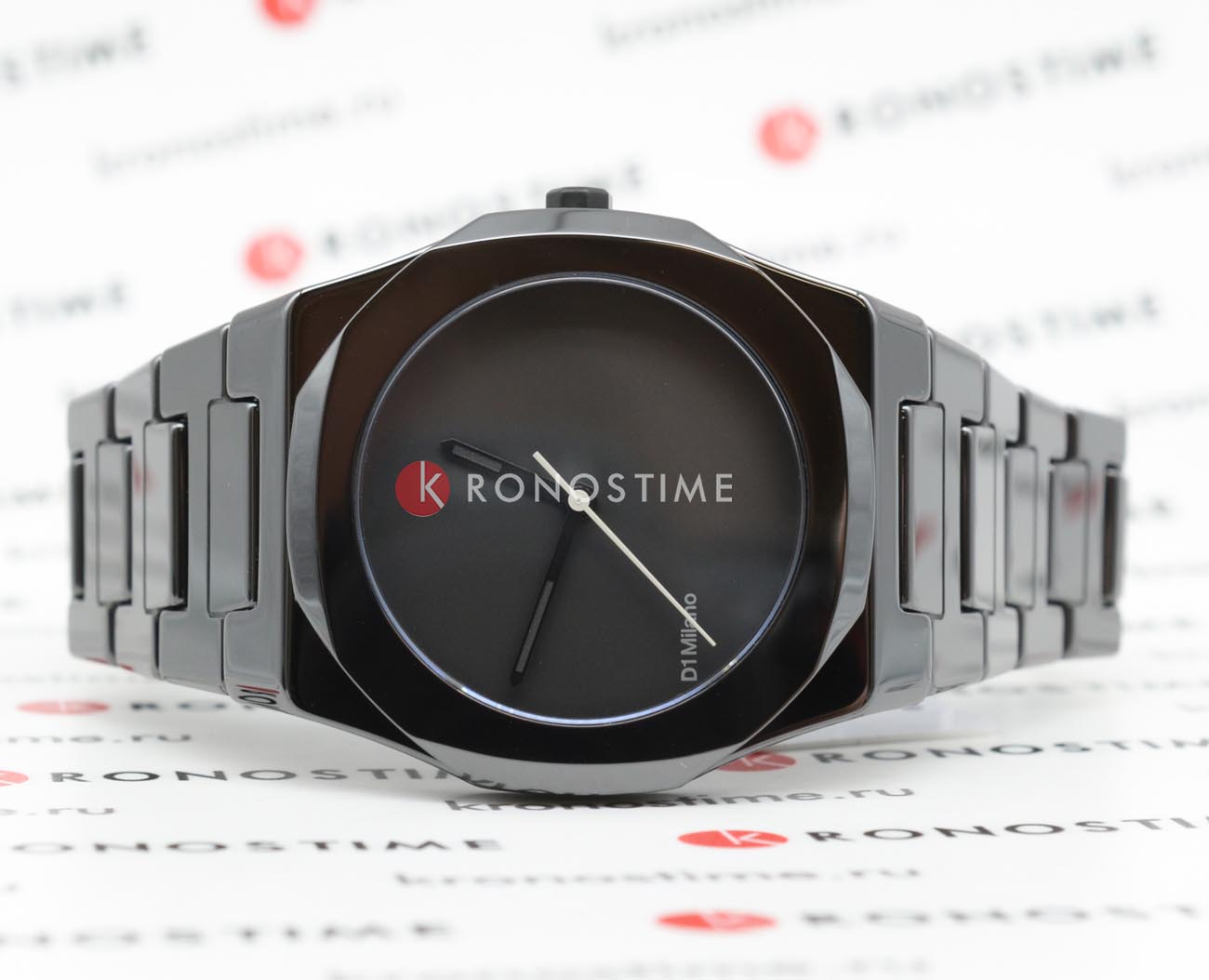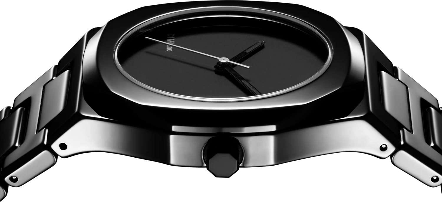 Часы D1 Milano Ceramic CEBU01 Pure Black – роскошный аксессуар для современных мужчин. Кварцевые часы с корпусом из черной отполированной керамики. Циферблат лаконичный, без индексов, с надписью бренда. Стрелки с люминесцентным покрытиемЛюминесцентное покрытиеПозволяет считывать показания времени в темноте. Производители наносят на стрелки, часовые индексы, безель или поверхность циферблата светонакопительный состав, дающий холодное свечение.. Стальная задняя крышка с PVD-покрытиемPVDУльтратонкое покрытие наносится в технике вакуумного напыления, сочетает в себе нитрид титана особой прочности со слоем золота или оксида хрома. Несёт в себе декоративную или защитную функцию. закреплена на 4 винтах, что обеспечивает надежность конструкции. Керамический браслет с застёжкой «бабочка» с кнопкамиЗастёжка "бабочка"Такой вид застёжки дополняется предохранителями, помогающими избежать случайного раскрытия браслета. Обладают изящным исполнением. . Часы сочетают в себе классический дизайн и современные технологии производства.