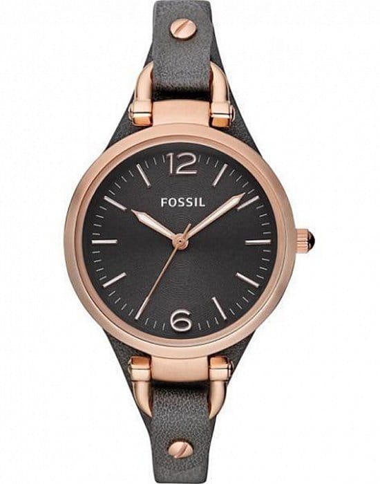 Стильные кварцевые женские наручные часы в стальном корпусе со стойким PVD покрытием на ремешке из натуральной кожи темно-серого цвета.