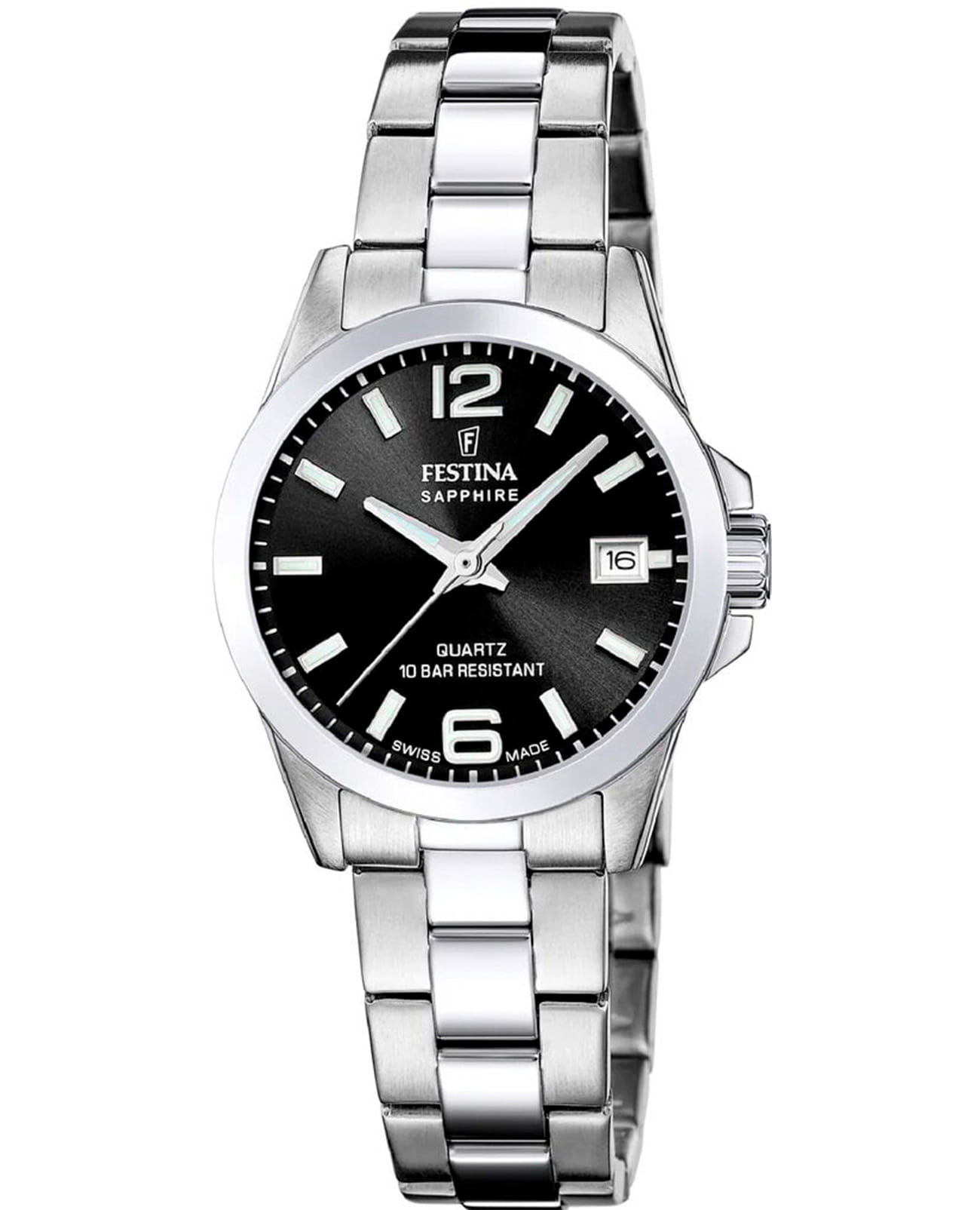 Женские кварцевые часы Festina F20049/6 из коллекции Swiss Made — это элегантный аксессуар, сочетающий швейцарское качество и классический стиль. Корпус диаметром 30 мм выполнен из нержавеющей стали серебряного цвета. Циферблат чёрного цвета дополнен окошком даты в положении 3 часов. Циферблат защищён сапфировым стекломСапфировое стеклоПрочный и надёжный материал из кристалла сапфира синтетического происхождения, характеризующийся особой твёрдостью и устойчивостью к царапинам и повреждениям.. Стрелки и метки с люминесцентным покрытиемЛюминесцентное покрытиеПозволяет считывать показания времени в темноте. Производители наносят на стрелки, часовые индексы, безель или поверхность циферблата светонакопительный состав, дающий холодное свечение., обеспечивающим хорошую читаемость в темноте. Заводная головка — вытягивающегося типа, задняя крышка — завинчивающаяся, что обеспечивает повышенную надёжность. Часы оснащены стальным браслетом на раскладной застёжкеРаскладная застёжкаТакой тип застёжки используется только на браслетах из металла. Она никогда не раскрывается полностью, происходит разделение на 2 и более частей. Раскладывающая застёжка снизит вероятность потери часов к минимуму. с кнопками. Механизм — швейцарский кварцевый калибр Ronda 785 с 42-месячным сроком службы батареи. Водонепроницаемость 100 м позволяет использовать часы для плавания. Идеальный выбор для тех, кто ценит точность, стиль и швейцарское мастерство.