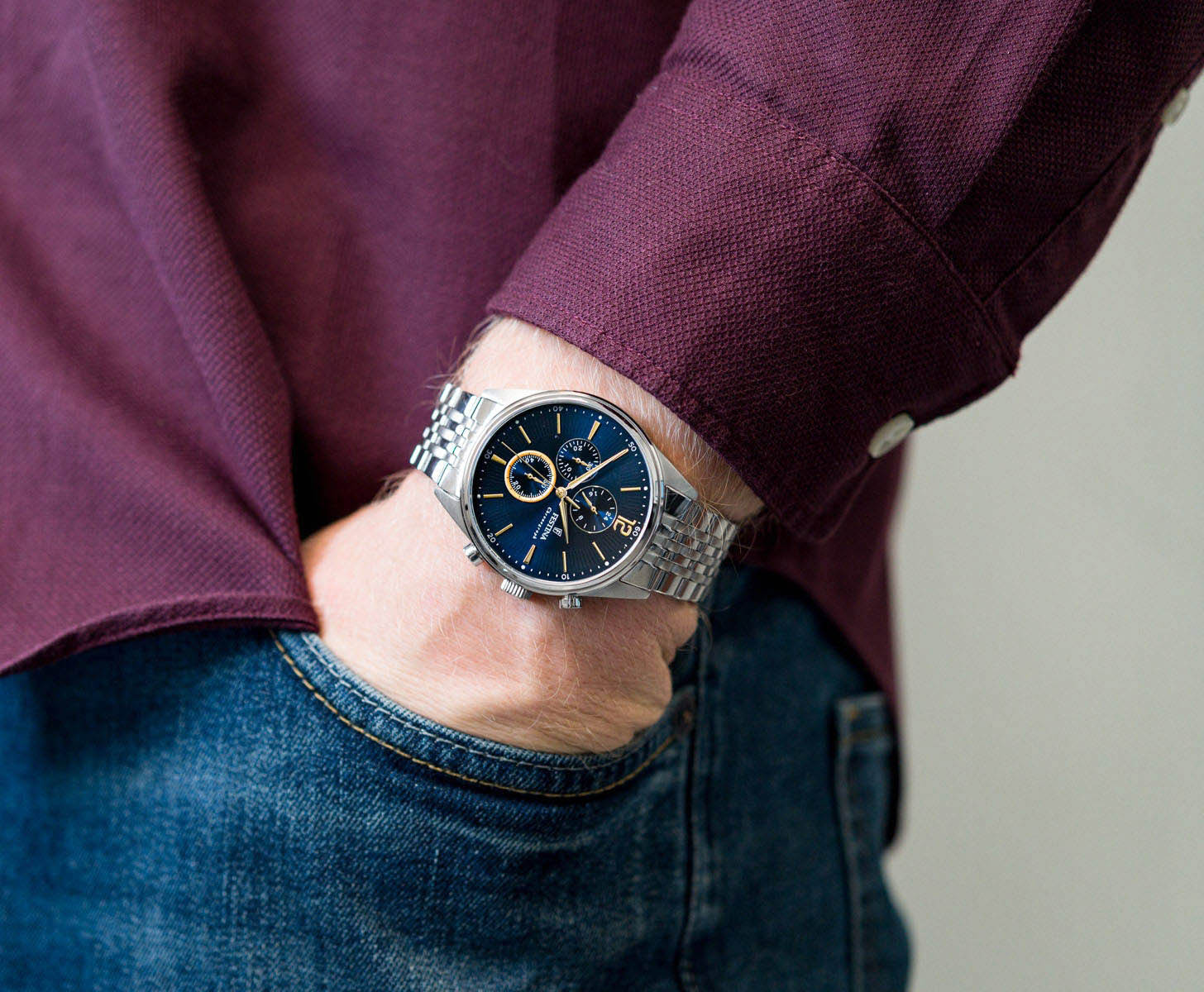 Эксклюзивный хронографХронографФункция позволяет измерять отрезки времени с особой точностью: часы, минуты, секунды. Верным признаком хронографа является наличие на циферблате 3 дополнительных окошек-счётчиков. с секундомеромСекундомерСекундоме́р — прибор, способный измерять интервалы времени с точностью до долей секунды., отличающийся продуманным дизайном и отделкой, придется по вкусу мужчинам, ценящим идеальное соотношение цены и качества.. Минеральное стеклоМинеральное стеклоМинеральное стекло представляет собой искусственно выращенный минерал кварца. Такое стекло отличается особой устойчивостью к повреждениям и царапинам. Уступает по некоторым качествам сапфировому стеклу. устойчивое к появлению царапин, обладающее высокой прозрачностью. Класс водозащиты: 50 метров, позволит защитить корпус от случайных брызг или капель дождя. Браслет с раскладной застёжкойРаскладная застёжкаТакой тип застёжки используется только на браслетах из металла. Она никогда не раскрывается полностью, происходит разделение на 2 и более частей. Раскладывающая застёжка снизит вероятность потери часов к минимуму..
