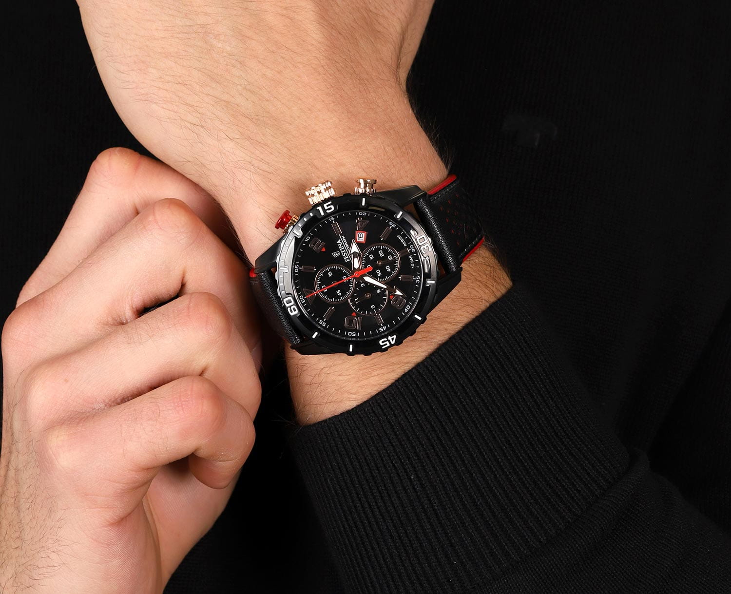 Часы-хронографХронографФункция позволяет измерять отрезки времени с особой точностью: часы, минуты, секунды. Верным признаком хронографа является наличие на циферблате 3 дополнительных окошек-счётчиков.. Кварцевый механизм с высокой точностью. Минеральное стеклоМинеральное стеклоМинеральное стекло представляет собой искусственно выращенный минерал кварца. Такое стекло отличается особой устойчивостью к повреждениям и царапинам. Уступает по некоторым качествам сапфировому стеклу. устойчивое к появлению царапин, обладающее высокой прозрачностью. Класс водозащиты: 100 метров, позволит плавать, нырять и заниматься другими водными видами спорта. Стрелки и метки с люминесцентным покрытиемЛюминесцентное покрытиеПозволяет считывать показания времени в темноте. Производители наносят на стрелки, часовые индексы, безель или поверхность циферблата светонакопительный состав, дающий холодное свечение.. Корпус часов изготовлен из нержавеющей стали c PVD-покрытиемPVDУльтратонкое покрытие наносится в технике вакуумного напыления, сочетает в себе нитрид титана особой прочности со слоем золота или оксида хрома. Несёт в себе декоративную или защитную функцию.. Кожаный ремешок с классической застежкой.