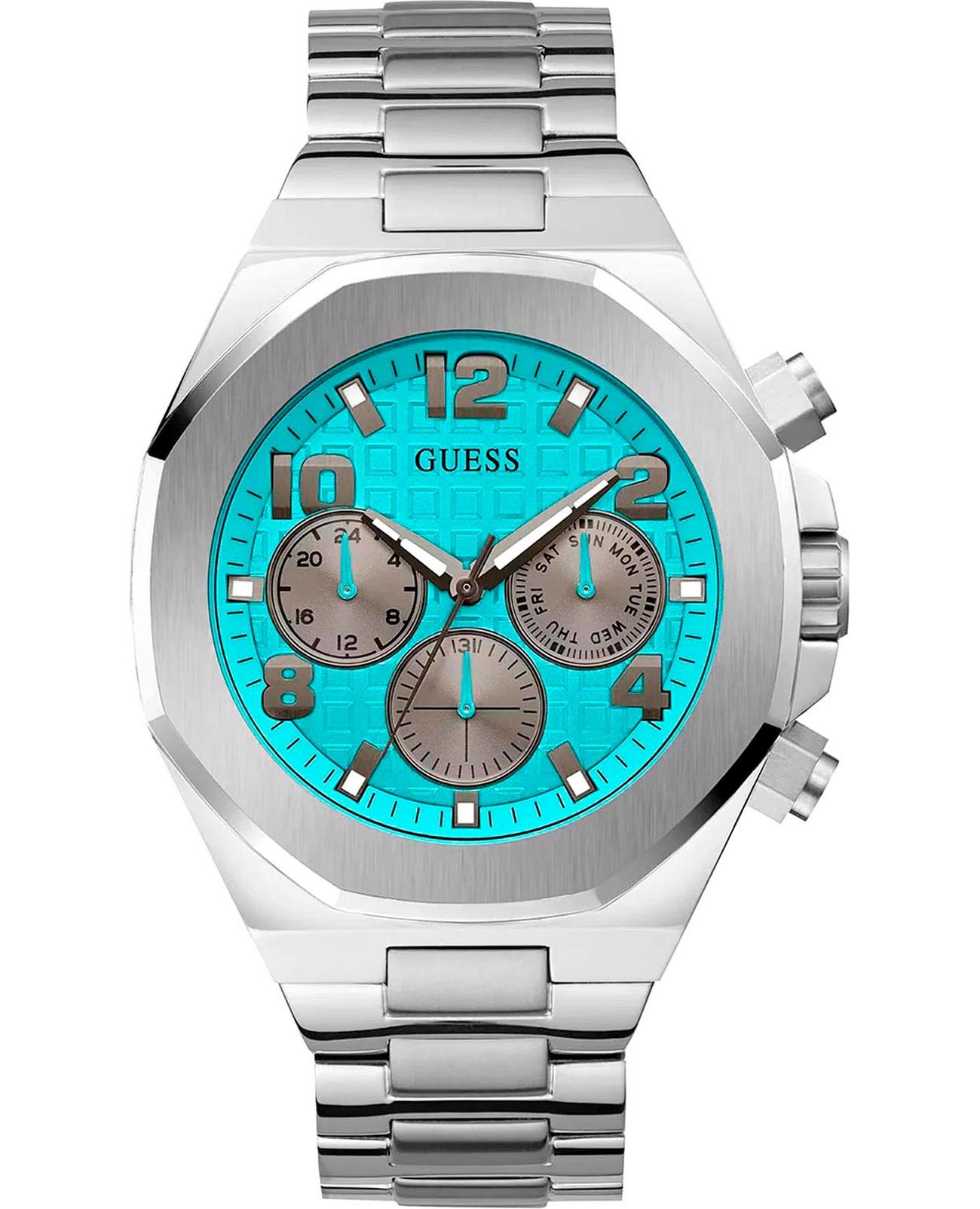 Мужские наручные часы с минеральным стекломМинеральное стеклоМинеральное стекло представляет собой искусственно выращенный минерал кварца. Такое стекло отличается особой устойчивостью к повреждениям и царапинам. Уступает по некоторым качествам сапфировому стеклу. Guess Empire GW0489G3, кварцевый механизм с высокой точностью. Класс водозащиты: 50 метров, позволит защитить корпус от случайных брызг или капель дождя. Корпус часов изготовлен из стали. Стальной браслет на раскладной застёжкеРаскладная застёжкаТакой тип застёжки используется только на браслетах из металла. Она никогда не раскрывается полностью, происходит разделение на 2 и более частей. Раскладывающая застёжка снизит вероятность потери часов к минимуму.. Стрелки с люминесцентным покрытиемЛюминесцентное покрытиеПозволяет считывать показания времени в темноте. Производители наносят на стрелки, часовые индексы, безель или поверхность циферблата светонакопительный состав, дающий холодное свечение.. 12-ти и 24-х часовой формат времени, дата и день недели вынесены на отдельные циферблаты. Метки в виде штрихов и арабских цифр. Рифленая заводная головка с защитой.