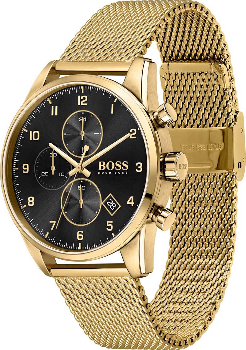 Мужские часы Hugo Boss Skymaster HB1513838 представлены в круглом 44-мм корпусе из нержавеющей стали 316L с золотистым IP-покрытиемIP-покрытиеМетод ионного напыления. Демонстрирует повышенную устойчивость к истиранию, окислению и химическим веществам. Под воздействием высокого давления и температуры около 1500°C молекулы металла надёжно соединяются с частицами корпуса часов. толщиной 10 мм. Оснащены кварцевым механизмом с функцией хронографаХронографФункция позволяет измерять отрезки времени с особой точностью: часы, минуты, секунды. Верным признаком хронографа является наличие на циферблате 3 дополнительных окошек-счётчиков. и секундомераСекундомерСекундоме́р — прибор, способный измерять интервалы времени с точностью до долей секунды.. Черный циферблат с арабскими цифрами защищен устойчивым к царапинам минеральным стекломМинеральное стеклоМинеральное стекло представляет собой искусственно выращенный минерал кварца. Такое стекло отличается особой устойчивостью к повреждениям и царапинам. Уступает по некоторым качествам сапфировому стеклу.. Стальной браслет с миланским плетением и с IP-покрытиемIP-покрытиеМетод ионного напыления. Демонстрирует повышенную устойчивость к истиранию, окислению и химическим веществам. Под воздействием высокого давления и температуры около 1500°C молекулы металла надёжно соединяются с частицами корпуса часов. дополнен раскладной застёжкойРаскладная застёжкаТакой тип застёжки используется только на браслетах из металла. Она никогда не раскрывается полностью, происходит разделение на 2 и более частей. Раскладывающая застёжка снизит вероятность потери часов к минимуму.. Водонепроницаемость 50 метров (5 ATM) обеспечивает защиту от брызг воды.