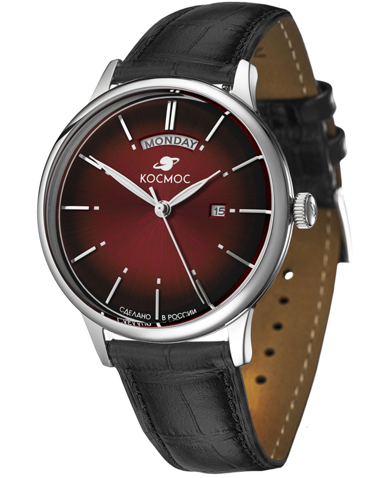 Мужские наручные часы Космос Орион K 011.11.35 — это сочетание традиций часового искусства 60-70-х годов и футуристического дизайна, вдохновленного космическими исследованиями. Они не только служат напоминанием о прошлом, но и побуждают задуматься о будущем, позволяя наслаждаться качеством и смыслом, вложенными в каждую деталь. Полированный корпус часов выполнен в виде силуэта летающей тарелки благодаря выпуклым формам стекла и нижней части корпуса. Стальные ушки, которые напоминают опоры летающей тарелки, завершает общий образ. На задней крышке часов выгравирован фантазийный сюжет – космическая станция будущего. Бордовый циферблат, выполненный в ретро-стиле, имеет выгнутые края, что требует использования сложной технологии производства. Такой дизайн был характерен для часов прошлых эпох. Секундная стрелка, имеющая изогнутую форму, идеально соответствует контуру циферблата. Выпуклый градиентный циферблат с шлифовкой, напоминающей солнечные лучи, украшен вручную изготовленными индексами, которые надежно крепятся на двух штифтах. Часовая и минутная стрелки, а также линия по краю циферблата, напоминающая ореол Земли, имеют люминесцентное покрытиеЛюминесцентное покрытиеПозволяет считывать показания времени в темноте. Производители наносят на стрелки, часовые индексы, безель или поверхность циферблата светонакопительный состав, дающий холодное свечение., которое светится в темноте, создавая впечатляющий визуальный эффект. В верхней части циферблата расположено окошко для отображения дня недели на английском языке, а индикаторы даты и дня недели дополнительно украшены фасочками, что придает им элегантный вид. Форма минерального стеклаМинеральное стеклоМинеральное стекло представляет собой искусственно выращенный минерал кварца. Такое стекло отличается особой устойчивостью к повреждениям и царапинам. Уступает по некоторым качествам сапфировому стеклу. также тщательно продумана, оно изогнуто как снаружи, так и изнутри. Это позволяет избежать искажений изображения на циферблате, в отличие от традиционного стекла с прямой внутренней частью, создающего эффект линзы. Ремешок из натуральной кожи черного цвета прекрасно дополняет часы. Также имеется возможность приобрести дополнительные ремни и браслеты миланского плетения, которые можно легко менять благодаря специальным крепежам. Заводная головка, застежка и ремешок украшены фирменным логотипом, подчеркивающим индивидуальность и стиль модели.