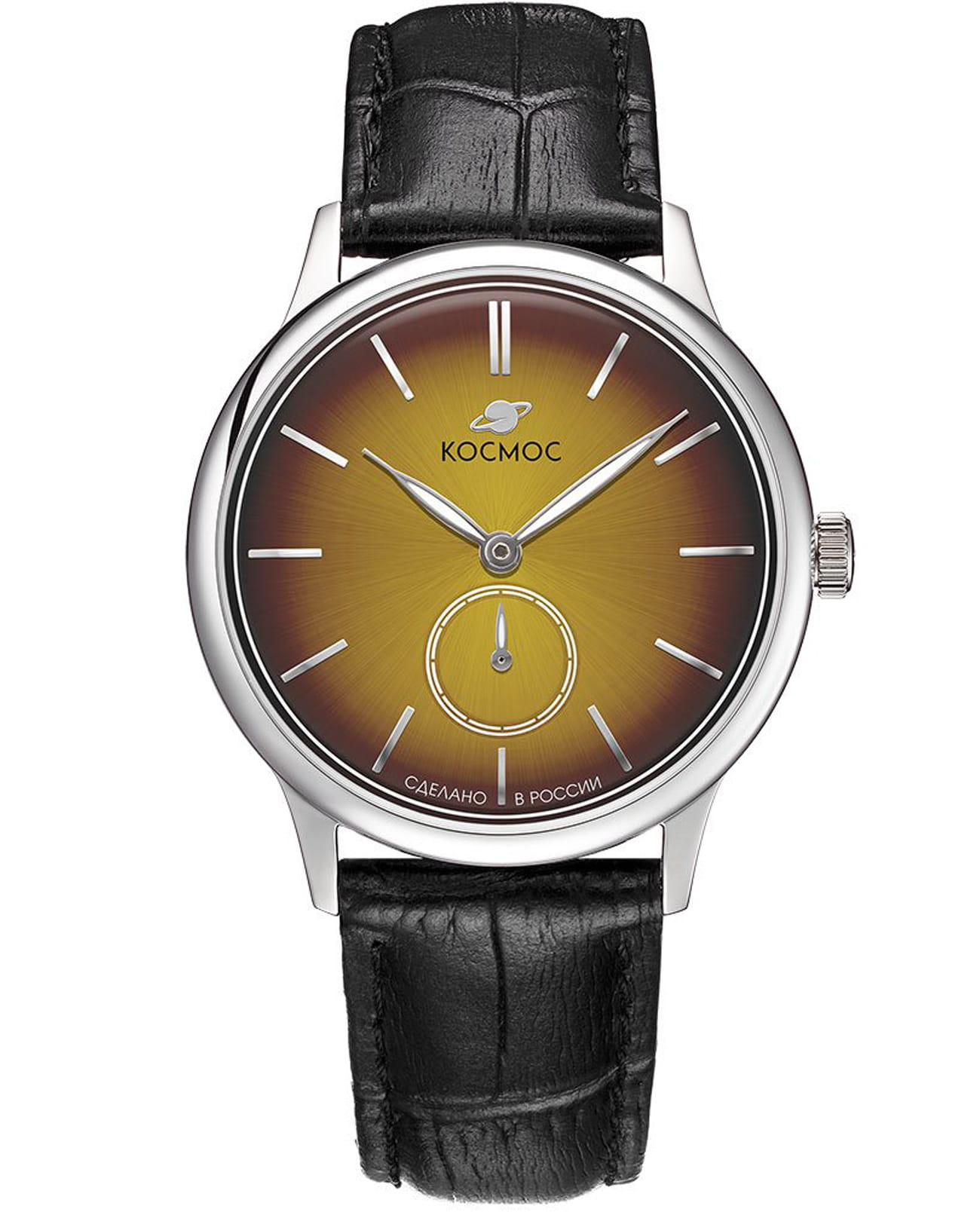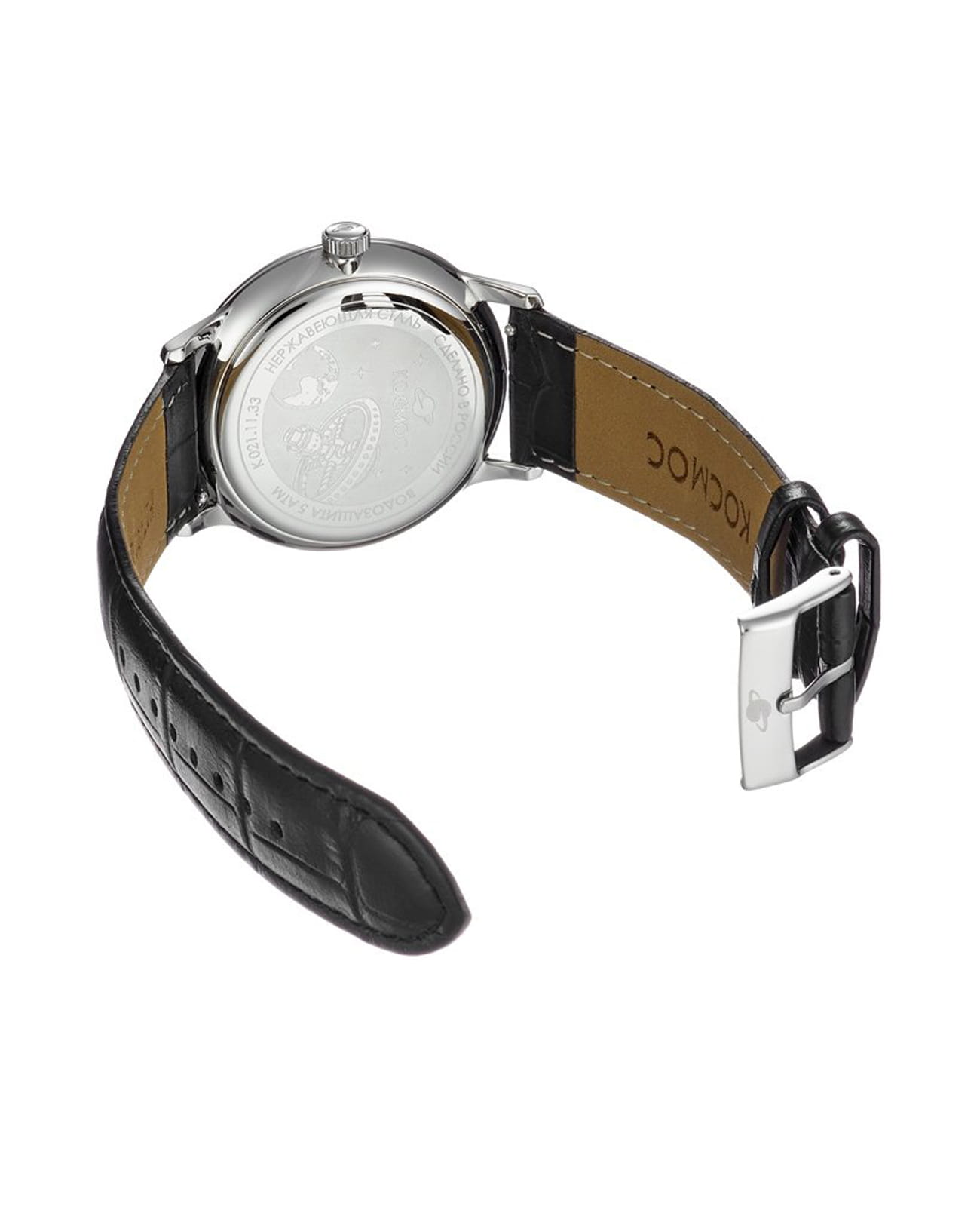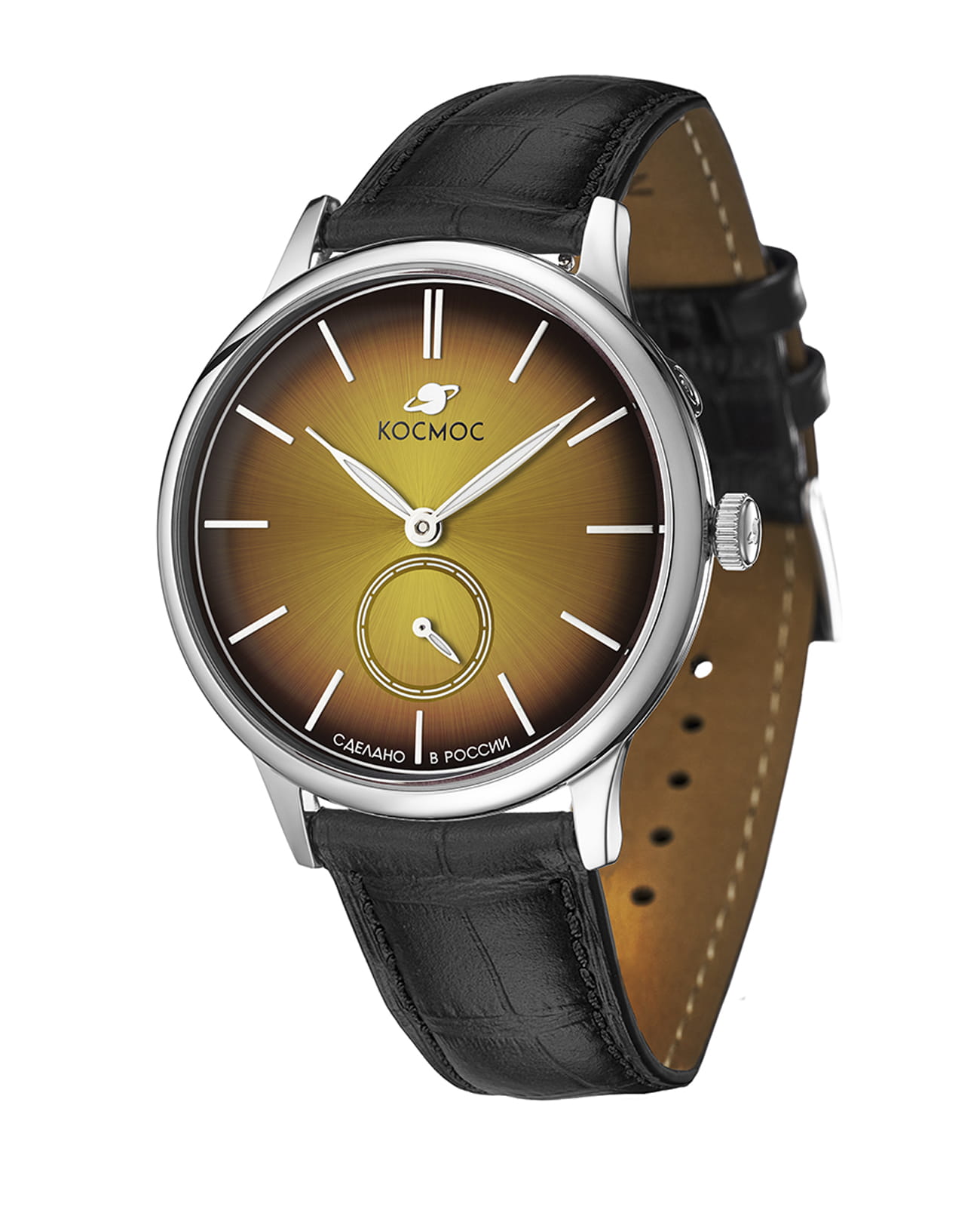 Мужские наручные часы Космос Сириус K 021.11.37 — это сочетание традиций часового искусства 60-70-х годов и футуристического дизайна, вдохновленного космическими исследованиями. Они не только служат напоминанием о прошлом, но и побуждают задуматься о будущем, позволяя наслаждаться качеством и смыслом, вложенными в каждую деталь. Полированный корпус часов выполнен в виде силуэта летающей тарелки благодаря выпуклым формам стекла и нижней части корпуса. Стальные ушки, которые напоминают опоры летающей тарелки, завершает общий образ. На задней крышке часов выгравирован фантазийный сюжет – космическая станция будущего. Желтый циферблат в ретро-стиле с выгнутыми краями требует сложной технологии производства, что делает их аналогами часов прошлых эпох. Кончик секундной стрелки изогнут так, чтобы гармонировать с формой циферблата. Выпуклый градиентный циферблат украшен шлифовкой, напоминающей солнечные лучи, и ручными индексами, надежно закрепленными на двух штифтах. Специальное люминесцентное покрытиеЛюминесцентное покрытиеПозволяет считывать показания времени в темноте. Производители наносят на стрелки, часовые индексы, безель или поверхность циферблата светонакопительный состав, дающий холодное свечение. нанесено на часовую, минутную и секундную стрелки, а также на пунктирные метки и окантовку циферблата, создавая эффект светящегося изображения в темноте. Форма минерального стеклаМинеральное стеклоМинеральное стекло представляет собой искусственно выращенный минерал кварца. Такое стекло отличается особой устойчивостью к повреждениям и царапинам. Уступает по некоторым качествам сапфировому стеклу. также тщательно продумана — оно изогнуто как снаружи, так и изнутри. Эта конструкция предотвращает искажение изображения на циферблате, в отличие от традиционных стекол с прямой внутренней частью, которые могут создавать оптические искажения. Часы комплектуются кожаным браслетом черного цвета с прошивкой. Корпус изготовлен из гипоаллергенной стали, что обеспечивает комфорт при ношении. Заводная головка, застежка и ремешок украшены фирменным логотипом, подчеркивающим индивидуальность данной модели.