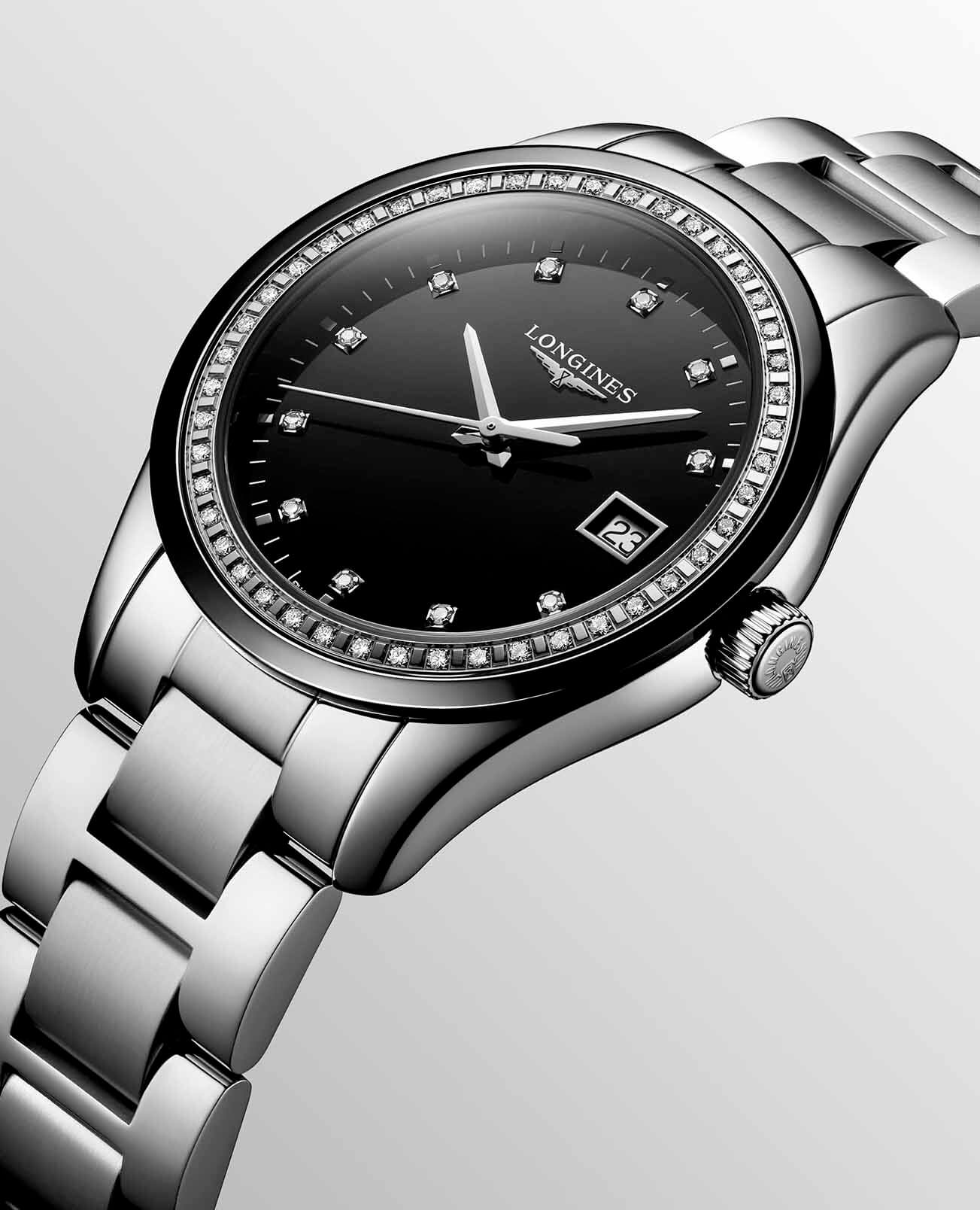 Женские швейцарские часы Longines Conquest Classic L2.387.0.57.6 отражают утончённый вкус владелицы. Изящная модель с белым перламутровым циферблатом инкрустирована 11 бриллиантами в 0,055 карата, на корпусе – 45 бриллиантами общим весом 0.306 карат. Швейцарский кварцевый калибр L152 обеспечивает высокую точность хода. Сапфировое стекло имеет многослойную антибликовую обработкуАнтибликовое покрытиеСлой оксида металла в 0,13-0,3 микрон, благодаря которому стекло часов не бликует и не отражает свет. Антибликовое покрытие уменьшает отражение света в 10 раз, обеспечивая отличную читаемость показателей циферблата.. Наручные часы оснащены календарём, индикатором EOLEOLПредставляет собой систему, уведомляющую владельца часов о необходимости замены элемента питания. За 2 недели до полного разряда батарейки секундная стрелка перестаёт ходить чётко и начинает перепрыгивать на 3-4 деления..