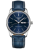 Циферблат с узором «sunray» отражает элегантный стиль. Внутри стального корпуса находится швейцарский автоматический механизм L897. Калибр отличается 64-часовым запасом хода и обеспечивает высокую точность показателей времени. Синий ремешок изготовлен из натуральной кожи аллигатора. Сапфировое стекло устойчиво к появлению царапин. Годовой календарь включает указатели месяца и дня недели.
