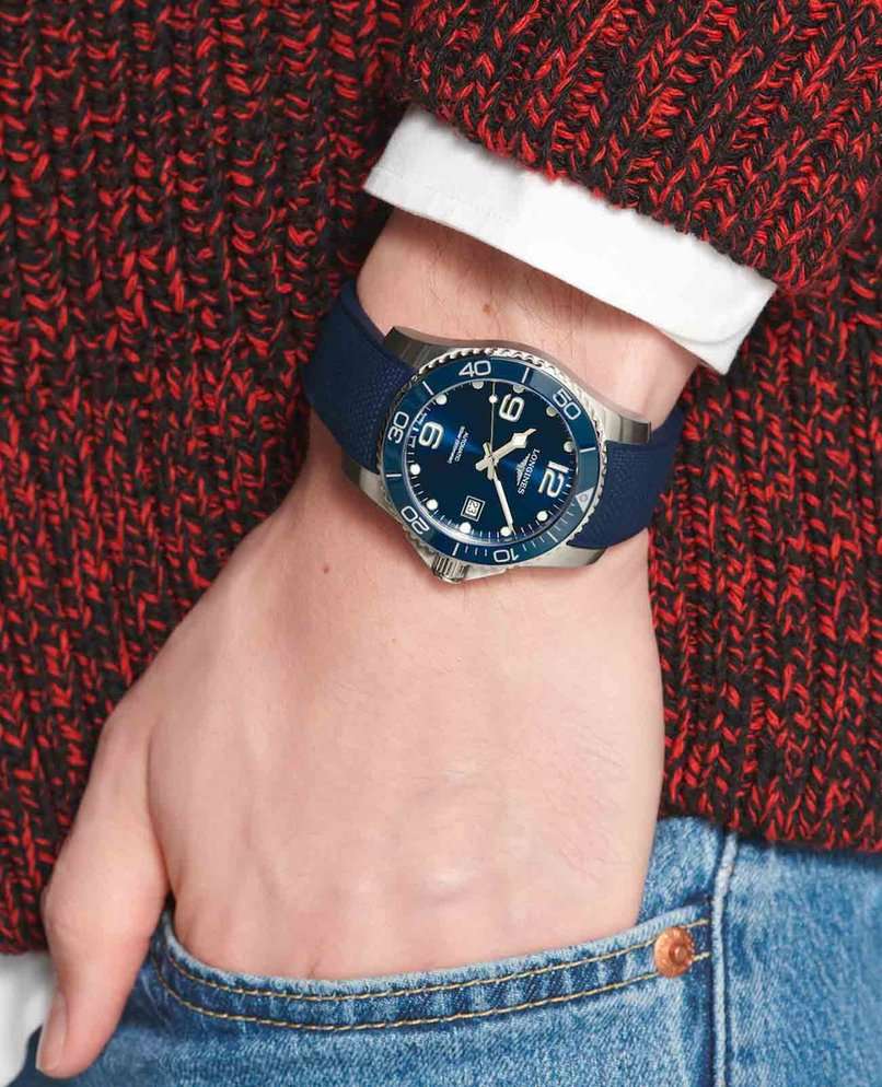 Мужские механические швейцарские часы с автоподзаводом Longines HydroConquest L3.781.4.96.9. Сапфировое стеклоСапфировое стеклоПрочный и надёжный материал из кристалла сапфира синтетического происхождения, характеризующийся особой твёрдостью и устойчивостью к царапинам и повреждениям. с антибликовым покрытием, устойчивое к мелким механическим повреждениям. Корпус часов изготовлен из нержавеющей стали. Вращающийся стальной безельБезельВнешний ободок, закрепляющий стекло. В спортивных часах так называется поворотное кольцо с делениями на циферблате, выполняет роль таймера – замеряет отрезки времени на шкале. Неподвижный безель – элемент декора. Однонаправленно вращающийся безель на дайверских часах позволяет фиксировать моменты погружения и выныривания на поверхность. с люминесцентным покрытиемЛюминесцентное покрытиеПозволяет считывать показания времени в темноте. Производители наносят на стрелки, часовые индексы, безель или поверхность циферблата светонакопительный состав, дающий холодное свечение. Superluminova из нержавеющей стали с PVD-покрытиемPVDУльтратонкое покрытие наносится в технике вакуумного напыления, сочетает в себе нитрид титана особой прочности со слоем золота или оксида хрома. Несёт в себе декоративную или защитную функцию. и керамики, защищенный от царапин, никогда не изнашивается и не выцветает. Стрелки и метки с люминесцентным покрытиемЛюминесцентное покрытиеПозволяет считывать показания времени в темноте. Производители наносят на стрелки, часовые индексы, безель или поверхность циферблата светонакопительный состав, дающий холодное свечение.. Окошко даты находится в положении 3 часа. Класс водозащиты: 300 метров, позволит плавать, нырять и заниматься другими водными видами спорта. Каучковый ремешок на раскладной застёжкеРаскладная застёжкаТакой тип застёжки используется только на браслетах из металла. Она никогда не раскрывается полностью, происходит разделение на 2 и более частей. Раскладывающая застёжка снизит вероятность потери часов к минимуму..