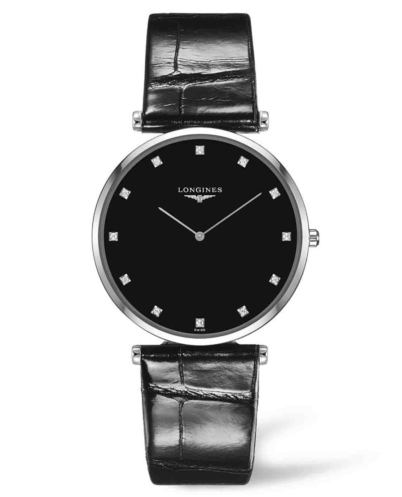 Компактный чёрный циферблат украшен 12 бриллиантами общим весом 0,081 карата. Элегантным дополнением стал ремешок из кожи аллигатора. Швейцарский кварцевый калибр L420 обеспечивает высокую точность хода. Сапфировое стекло не допускает появления царапин на поверхности.