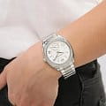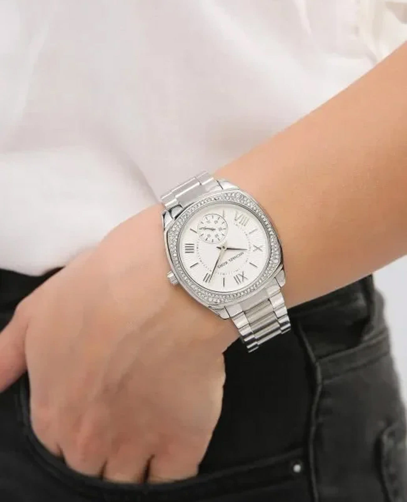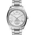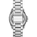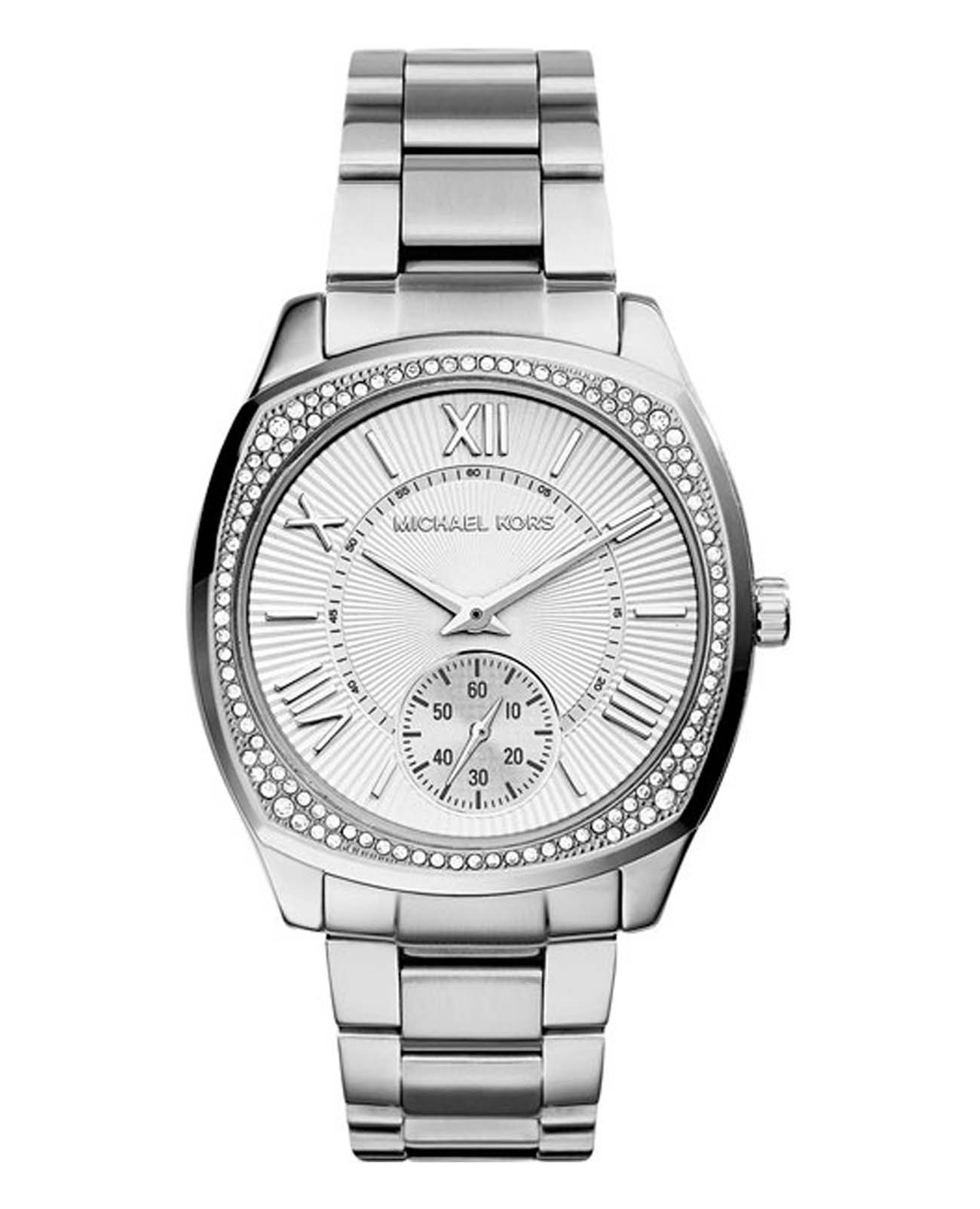 Женские американские часы Michael Kors Bryn MK6133, кварцевый механизм с высокой точностью. Минеральное стеклоМинеральное стеклоМинеральное стекло представляет собой искусственно выращенный минерал кварца. Такое стекло отличается особой устойчивостью к повреждениям и царапинам. Уступает по некоторым качествам сапфировому стеклу., устойчивое к мелким механическим повреждениям. Корпус часов выполнен из нержавеющей стали. БезельБезельВнешний ободок, закрепляющий стекло. В спортивных часах так называется поворотное кольцо с делениями на циферблате, выполняет роль таймера – замеряет отрезки времени на шкале. Неподвижный безель – элемент декора. Однонаправленно вращающийся безель на дайверских часах позволяет фиксировать моменты погружения и выныривания на поверхность. украшен кристаллами. Секундная стрелка вынесена на отдельный циферблат. Класс водозащиты: 50 метров, позволит защитить корпус от случайных брызг или капель дождя. Стальной браслет на раскладной застёжкеРаскладная застёжкаТакой тип застёжки используется только на браслетах из металла. Она никогда не раскрывается полностью, происходит разделение на 2 и более частей. Раскладывающая застёжка снизит вероятность потери часов к минимуму..