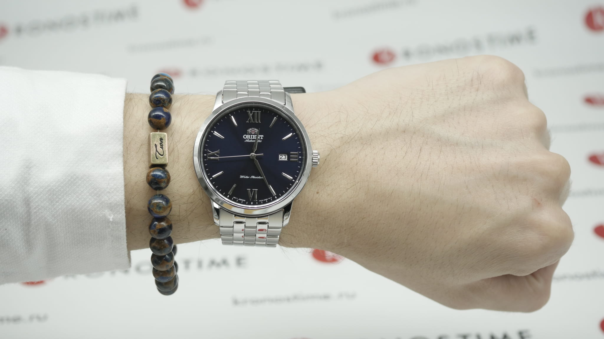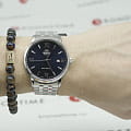 Мужские механические часы Orient RA-AC0F09L1 — это утончённый классический аксессуар, который идеально дополнит деловой образ. Модель оснащена калибром F6722 с автоподзаводом и возможностью ручной подзаводки. Механизм имеет 22 драгоценных камня и обеспечивает запас хода до 40 часов. Также реализована функция стоп-секунды для точной установки времени. Циферблат синего цвета выполнен по технологии Sunray, создающей эффект расходящихся солнечных лучей. Метки представлены в виде штрихов и римских цифр, а информация о дате вынесена в окошко на отметке 3 часов. Защиту циферблата обеспечивает сапфировое стеклоСапфировое стеклоПрочный и надёжный материал из кристалла сапфира синтетического происхождения, характеризующийся особой твёрдостью и устойчивостью к царапинам и повреждениям., устойчивое к царапинам и повреждениям. Корпус диаметром 41 мм изготовлен из нержавеющей стали, а задняя крышка — завинчивающаяся и прозрачная, что позволяет рассмотреть работу механизма и подчёркивает внимание к деталям внутренней отделки. Рифлёная заводная головка обеспечивает удобство настройки времени и дополнительный элемент стиля. Браслет выполнен из стали и оснащён раскладной застёжкойРаскладная застёжкаТакой тип застёжки используется только на браслетах из металла. Она никогда не раскрывается полностью, происходит разделение на 2 и более частей. Раскладывающая застёжка снизит вероятность потери часов к минимуму., обеспечивающей комфорт и уверенную фиксацию на запястье. Ширина браслета составляет 22 мм, что делает его гармонично сочетающимся с корпусом. Часы водонепроницаемы до 50 метров (), что позволяет использовать их в повседневных условиях — при мытье рук или под лёгким дождём. Эти часы станут универсальным аксессуаром для тех, кто ценит сочетание традиций, точности и эстетики — идеальный выбор для повседневной носки и торжественных случаев.
