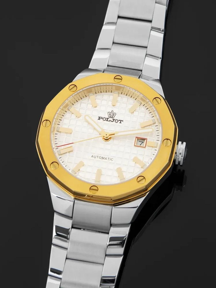 Poljot Ural 8215.365244Б — стильные механические часы с автоподзаводом, сочетающие брутальный характер и современную элегантность. Корпус выполнен из нержавеющей стали, что придаёт модели монолитность и прочность, а глубокий циферблат подчеркивает премиальный облик. Стальной браслет на застёжке-бабочке с кнопкамиЗастёжка "бабочка"Такой вид застёжки дополняется предохранителями, помогающими избежать случайного раскрытия браслета. Обладают изящным исполнением. . БезельБезельВнешний ободок, закрепляющий стекло. В спортивных часах так называется поворотное кольцо с делениями на циферблате, выполняет роль таймера – замеряет отрезки времени на шкале. Неподвижный безель – элемент декора. Однонаправленно вращающийся безель на дайверских часах позволяет фиксировать моменты погружения и выныривания на поверхность. с PVD-покрытиемPVDУльтратонкое покрытие наносится в технике вакуумного напыления, сочетает в себе нитрид титана особой прочности со слоем золота или оксида хрома. Несёт в себе декоративную или защитную функцию.. Внутри установлен надёжный японский механизм Miyota 8215, обеспечивающий точный ход и плавную работу стрелок. Широкие метки и стрелки с люминесцентным покрытиемЛюминесцентное покрытиеПозволяет считывать показания времени в темноте. Производители наносят на стрелки, часовые индексы, безель или поверхность циферблата светонакопительный состав, дающий холодное свечение. гарантируют превосходную читаемость в любое время суток, а окно даты добавляет удобства. Прочное минеральное стеклоМинеральное стеклоМинеральное стекло представляет собой искусственно выращенный минерал кварца. Такое стекло отличается особой устойчивостью к повреждениям и царапинам. Уступает по некоторым качествам сапфировому стеклу. защищает циферблат от повреждений, а водонепроницаемость до 10 бар делает часы надёжным спутником как в деловом, так и активном образе жизни. Poljot Ural — воплощение силы, точности и мужского стиля, созданное для тех, кто ценит механику и уверенность в каждой детали.