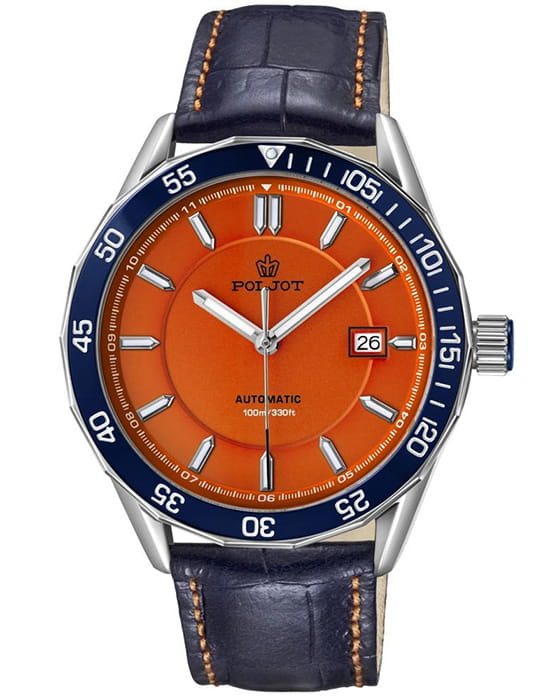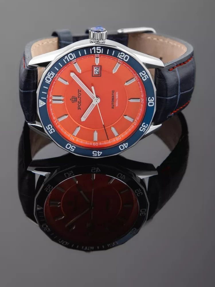 Poljot NH35A.181262 — надёжные механические мужские часы с автоподзаводом, сочетающие техническую точность и выразительный спортивный стиль. Корпус из нержавеющей стали подчёркивает прочность конструкции, а насыщенный циферблат с акцентами на стрелках и метках придаёт модели динамичный и современный облик. БезельБезельВнешний ободок, закрепляющий стекло. В спортивных часах так называется поворотное кольцо с делениями на циферблате, выполняет роль таймера – замеряет отрезки времени на шкале. Неподвижный безель – элемент декора. Однонаправленно вращающийся безель на дайверских часах позволяет фиксировать моменты погружения и выныривания на поверхность. с PVD-покрытиемPVDУльтратонкое покрытие наносится в технике вакуумного напыления, сочетает в себе нитрид титана особой прочности со слоем золота или оксида хрома. Несёт в себе декоративную или защитную функцию.. Внутри установлен проверенный японский механизм SEIKO NH35, обеспечивающий стабильную работу и плавный ход секундной стрелки. Окно даты добавляет функциональности, а широкие метки с люминесцентным покрытиемЛюминесцентное покрытиеПозволяет считывать показания времени в темноте. Производители наносят на стрелки, часовые индексы, безель или поверхность циферблата светонакопительный состав, дающий холодное свечение. обеспечивают отличную читаемость даже в темноте. Прочное минеральное стеклоМинеральное стеклоМинеральное стекло представляет собой искусственно выращенный минерал кварца. Такое стекло отличается особой устойчивостью к повреждениям и царапинам. Уступает по некоторым качествам сапфировому стеклу. защищает циферблат от царапин, а ремешок из натуральной кожи с контрастной прострочкой гарантирует комфорт и надёжную посадку. Poljot — часы с характером, созданные для тех, кто ценит точность, качество и спортивную уверенность в каждой детали.