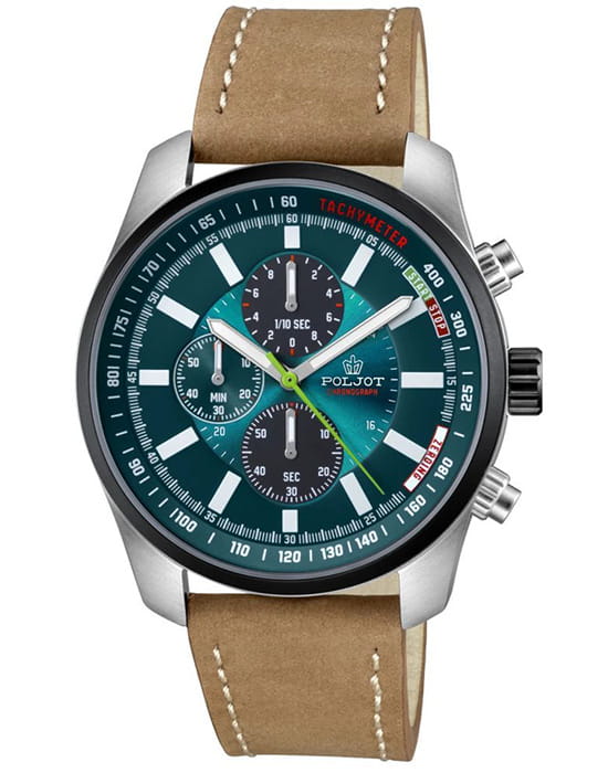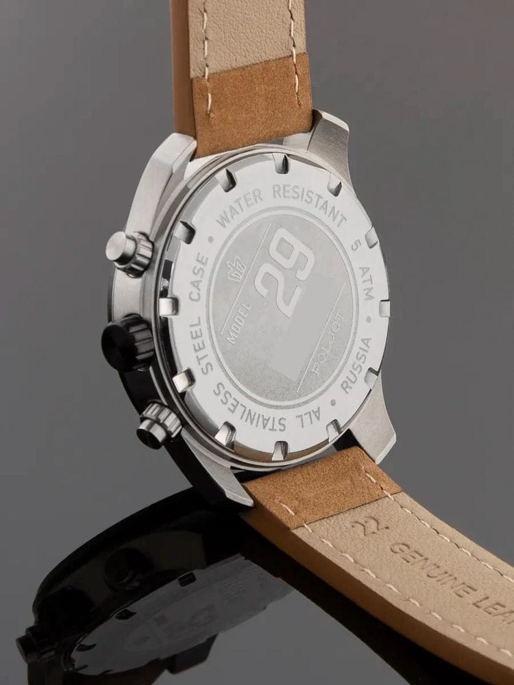 Poljot VD55.291236 — выразительные мужские часы с ярким спортивным акцентом, созданные для тех, кто ценит функциональность и характерный дизайн. Корпус из нержавеющей стали подчёркивает мощь и надёжность модели, а циферблат с контрастными счётчиками хронографаХронографФункция позволяет измерять отрезки времени с особой точностью: часы, минуты, секунды. Верным признаком хронографа является наличие на циферблате 3 дополнительных окошек-счётчиков. придаёт образу динамику и энергичность. БезельБезельВнешний ободок, закрепляющий стекло. В спортивных часах так называется поворотное кольцо с делениями на циферблате, выполняет роль таймера – замеряет отрезки времени на шкале. Неподвижный безель – элемент декора. Однонаправленно вращающийся безель на дайверских часах позволяет фиксировать моменты погружения и выныривания на поверхность. с PVD-покрытиемPVDУльтратонкое покрытие наносится в технике вакуумного напыления, сочетает в себе нитрид титана особой прочности со слоем золота или оксида хрома. Несёт в себе декоративную или защитную функцию.. Механизм SEIKO VD55 (Япония) обеспечивает точную работу секундомера и надёжность в ежедневном использовании. Широкие стрелки и метки с люминесцентным покрытиемЛюминесцентное покрытиеПозволяет считывать показания времени в темноте. Производители наносят на стрелки, часовые индексы, безель или поверхность циферблата светонакопительный состав, дающий холодное свечение. гарантируют превосходную читаемость в любое время суток. Прочное минеральное стеклоМинеральное стеклоМинеральное стекло представляет собой искусственно выращенный минерал кварца. Такое стекло отличается особой устойчивостью к повреждениям и царапинам. Уступает по некоторым качествам сапфировому стеклу. защищает циферблат, а водозащита до 5 ATM делает часы устойчивыми к влаге. Ремешок из натуральной кожи с контрастной строчкой завершает образ, обеспечивая комфорт и элегантность. Poljot — это стиль и точность, объединённые в спортивной форме с фирменным русским характером.