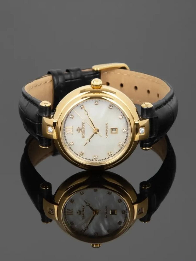 Poljot Maya NH05.676015 — утончённые женские механические часы с автоподзаводом, в которых классическая элегантность сочетается с современным характером. Корпус из нержавеющей стали с PVD-покрытиемPVDУльтратонкое покрытие наносится в технике вакуумного напыления, сочетает в себе нитрид титана особой прочности со слоем золота или оксида хрома. Несёт в себе декоративную или защитную функцию. подчёркивает изящество формы, а глубокий синий циферблат, украшенный кристаллами вместо меток, придаёт модели благородное сияние. Римская цифра XII и аккуратное окно даты на позиции «6 часов» сохраняют баланс и утончённость дизайна. Механизм NH05 SEIKO (Япония) обеспечивает плавный ход стрелок и надёжную работу. Прочное минеральное стеклоМинеральное стеклоМинеральное стекло представляет собой искусственно выращенный минерал кварца. Такое стекло отличается особой устойчивостью к повреждениям и царапинам. Уступает по некоторым качествам сапфировому стеклу. защищает циферблат от повреждений, а ремешок из натуральной кожи гарантирует комфорт и элегантное прилегание. Poljot — воплощение женственности, точности и утончённого вкуса, созданное для тех, кто ценит механику в изысканном исполнении.