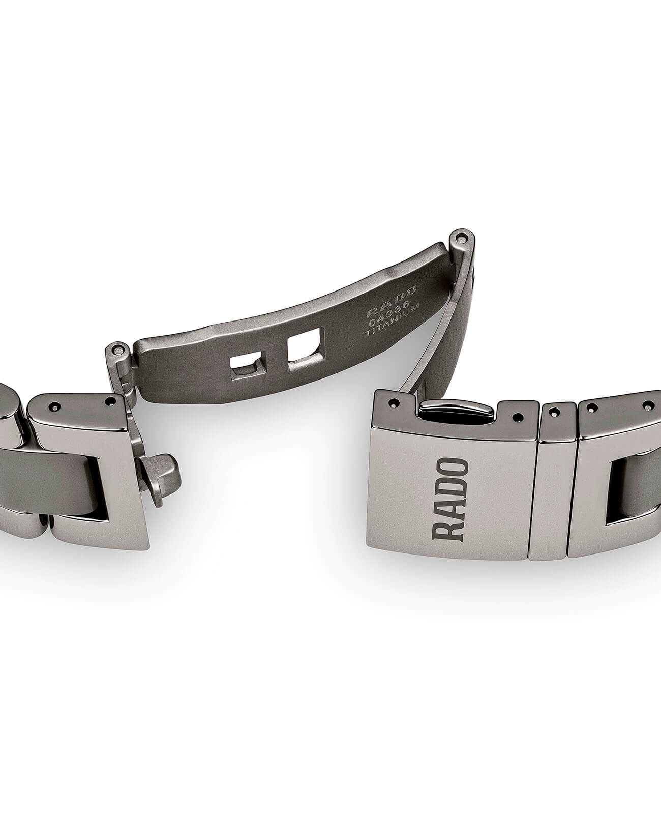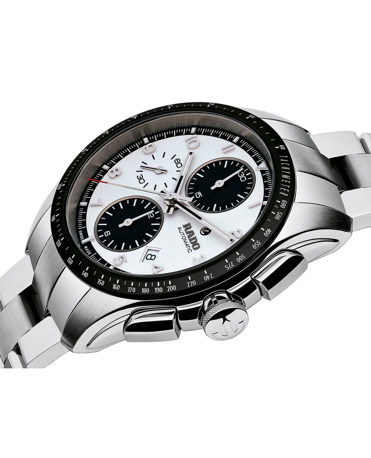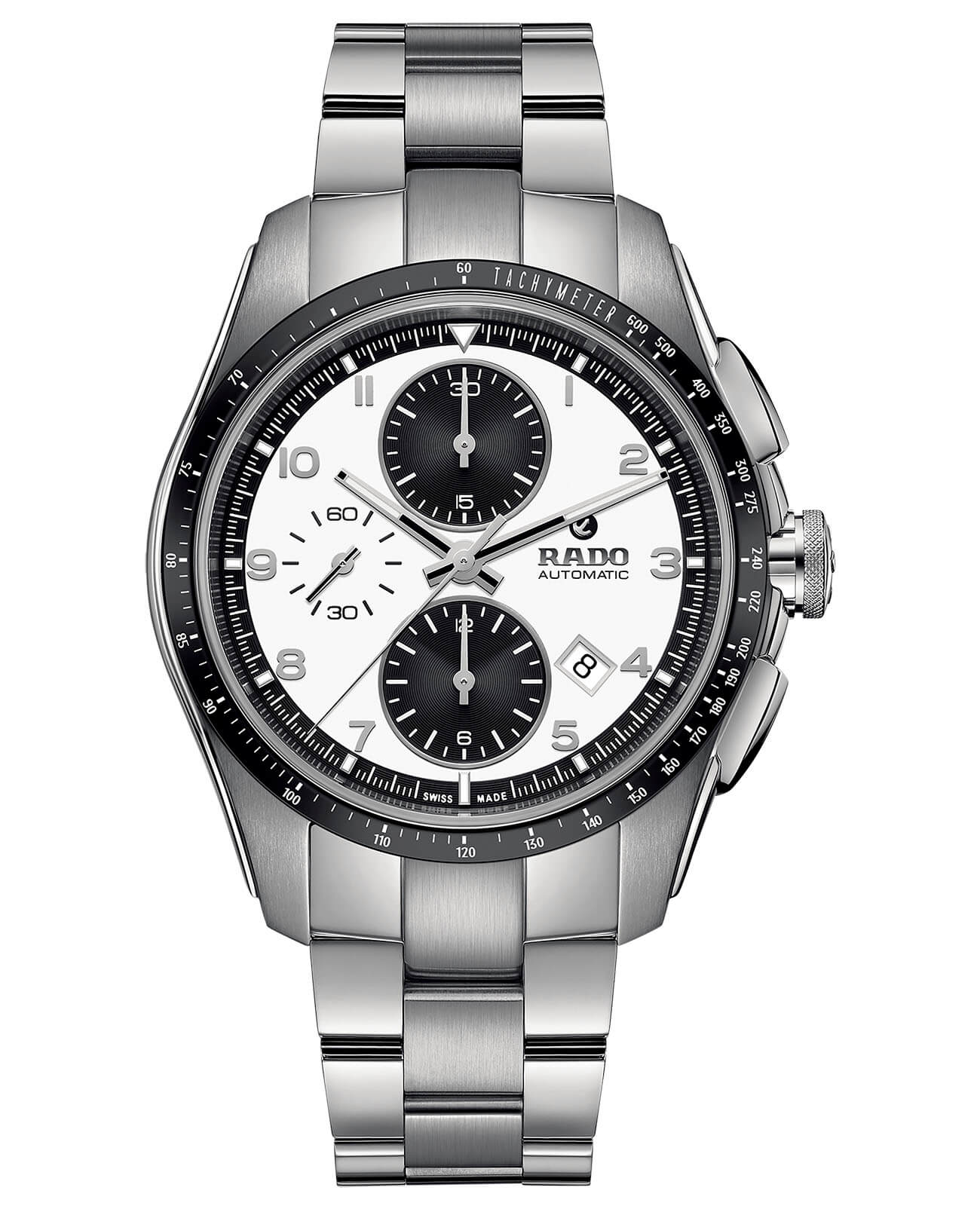 Классический хронографХронографФункция позволяет измерять отрезки времени с особой точностью: часы, минуты, секунды. Верным признаком хронографа является наличие на циферблате 3 дополнительных окошек-счётчиков. с элементами спортивного дизайна идеально подойдёт к образу солидного и делового мужчины. Винтажным элементом стал оригинальный дизайн «panda-style». Серебристо-чёрная расцветка позволяет носить часы при любых обстоятельствах. Модель оснащена швейцарским автоматическим механизмом ETA A05.H21, запас хода которого увеличен до 54 часов. Скелетонизированная задняя крышка корпуса. Стекло из сапфира с антибликовым покрытием. Корпус и браслет из стали 316L с антикоррозионными свойствами. Чёрный безельБезельВнешний ободок, закрепляющий стекло. В спортивных часах так называется поворотное кольцо с делениями на циферблате, выполняет роль таймера – замеряет отрезки времени на шкале. Неподвижный безель – элемент декора. Однонаправленно вращающийся безель на дайверских часах позволяет фиксировать моменты погружения и выныривания на поверхность. из высокотехнологичной керамикиВысокотехнологичная керамикаИнновационный запатентованный Rado материал с гладкой или матовой поверхностью. Керамика за счёт кристаллической структуры обладает повышенной устойчивостью от возникновения царапин. Материал способен принимать температуру тела человека, обеспечивая невероятный комфорт при ношении.. Люминесцентная подсветкаЛюминесцентное покрытиеПозволяет считывать показания времени в темноте. Производители наносят на стрелки, часовые индексы, безель или поверхность циферблата светонакопительный состав, дающий холодное свечение. стрелок. Водонепроницаемость 100 метров. Секундомер, отображение даты, шкала тахиметраТахиметрРазмеченная шкала, располагается на ободке или безеле часов. Тахиметр позволяет рассчитать скорость на определённом участке пути, расстояние измеряется в километрах или милях.. . Диаметр корпуса: 44 мм.