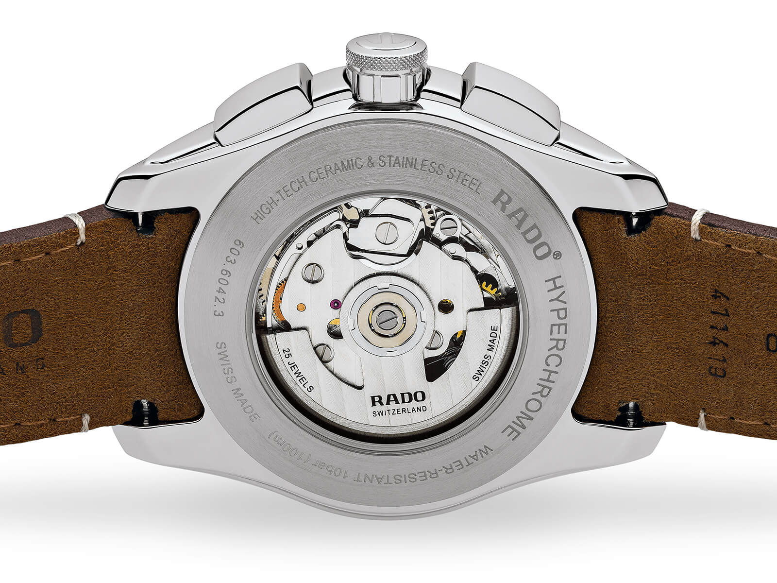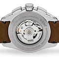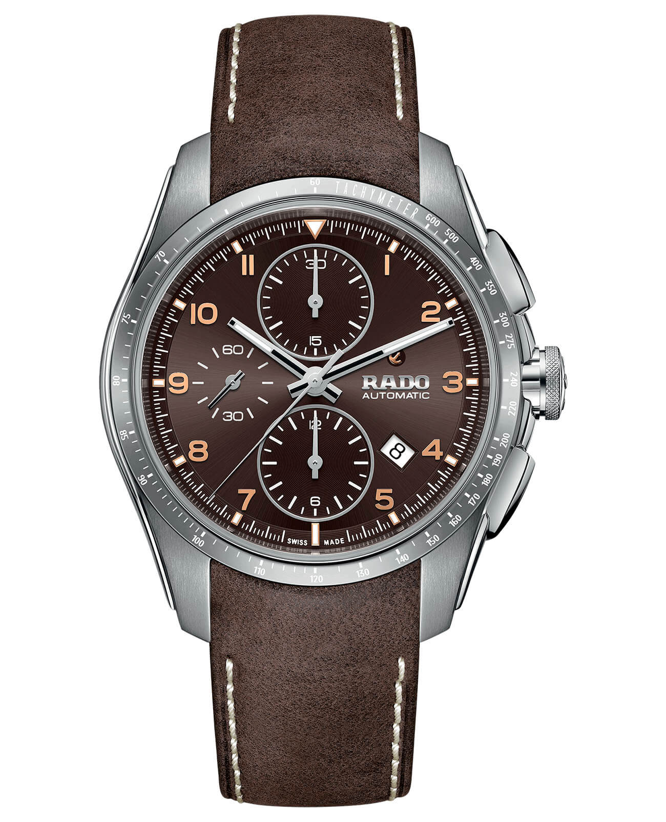 Премиальный хронографХронографФункция позволяет измерять отрезки времени с особой точностью: часы, минуты, секунды. Верным признаком хронографа является наличие на циферблате 3 дополнительных окошек-счётчиков. на классическом коричневом ремешке из натуральной кожи позволит поддерживать правильный имидж. Это лучший вариант для солидного бизнесмена или руководителя компании. Наручные часы с автоподзаводом оснащены швейцарским калибром ETA A05.H21, запас хода сохраняется до 54 часов. Прозрачная задняя крышка корпуса позволяет наблюдать за движением деталей механизма. Корпус из нержавеющей стали 316L. БезельБезельВнешний ободок, закрепляющий стекло. В спортивных часах так называется поворотное кольцо с делениями на циферблате, выполняет роль таймера – замеряет отрезки времени на шкале. Неподвижный безель – элемент декора. Однонаправленно вращающийся безель на дайверских часах позволяет фиксировать моменты погружения и выныривания на поверхность. из высокотехнологичной керамикиВысокотехнологичная керамикаИнновационный запатентованный Rado материал с гладкой или матовой поверхностью. Керамика за счёт кристаллической структуры обладает повышенной устойчивостью от возникновения царапин. Материал способен принимать температуру тела человека, обеспечивая невероятный комфорт при ношении.. Стрелки с люминесцентной подсветкойЛюминесцентное покрытиеПозволяет считывать показания времени в темноте. Производители наносят на стрелки, часовые индексы, безель или поверхность циферблата светонакопительный состав, дающий холодное свечение.. Сапфировое стекло с антибликовой поверхностью. Водостойкость 100 метров. Секундомер, отображение даты. . Диаметр корпуса: 44 мм.