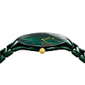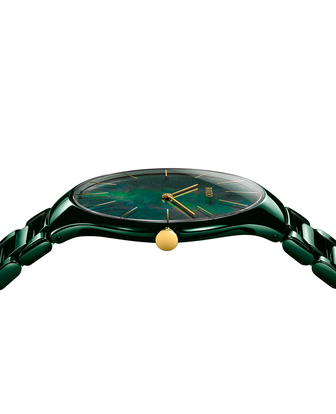 Оригинальный аксессуар в зелёном цвете имеет оригинальный циферблат с изображением листа, сквозь которого пробиваются лучи солнца, модель олицетворяет символы гармоничной природы. Моноблочный корпус и безельБезельВнешний ободок, закрепляющий стекло. В спортивных часах так называется поворотное кольцо с делениями на циферблате, выполняет роль таймера – замеряет отрезки времени на шкале. Неподвижный безель – элемент декора. Однонаправленно вращающийся безель на дайверских часах позволяет фиксировать моменты погружения и выныривания на поверхность. изготовлены из сочетания нержавеющей стали 316L с PVD-покрытиемPVDУльтратонкое покрытие наносится в технике вакуумного напыления, сочетает в себе нитрид титана особой прочности со слоем золота или оксида хрома. Несёт в себе декоративную или защитную функцию. и высокотехнологичной керамикиВысокотехнологичная керамикаИнновационный запатентованный Rado материал с гладкой или матовой поверхностью. Керамика за счёт кристаллической структуры обладает повышенной устойчивостью от возникновения царапин. Материал способен принимать температуру тела человека, обеспечивая невероятный комфорт при ношении.. Кварцевый калибр ETA 282.001 с высокой точностью хода. Антибликовая обработка сапфирового стекла. Водонепроницаемость до 3 бар. . Диаметр корпуса: 39 мм.